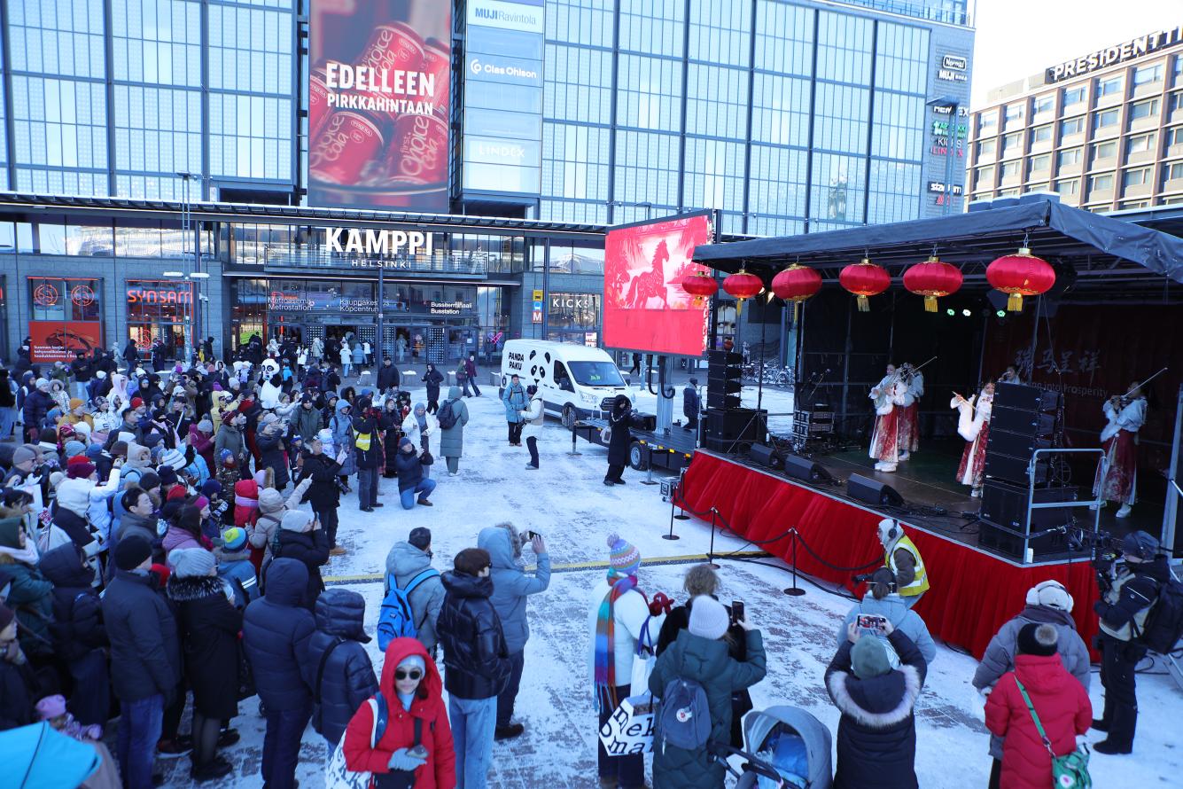 赫尔辛基KAMPPI广场热闹非凡,新春文艺演出在新民乐《一马当先》中拉开序幕。武术、舞蹈、民乐等节目精彩纷呈,生动展现中国传统文化的创新活力。