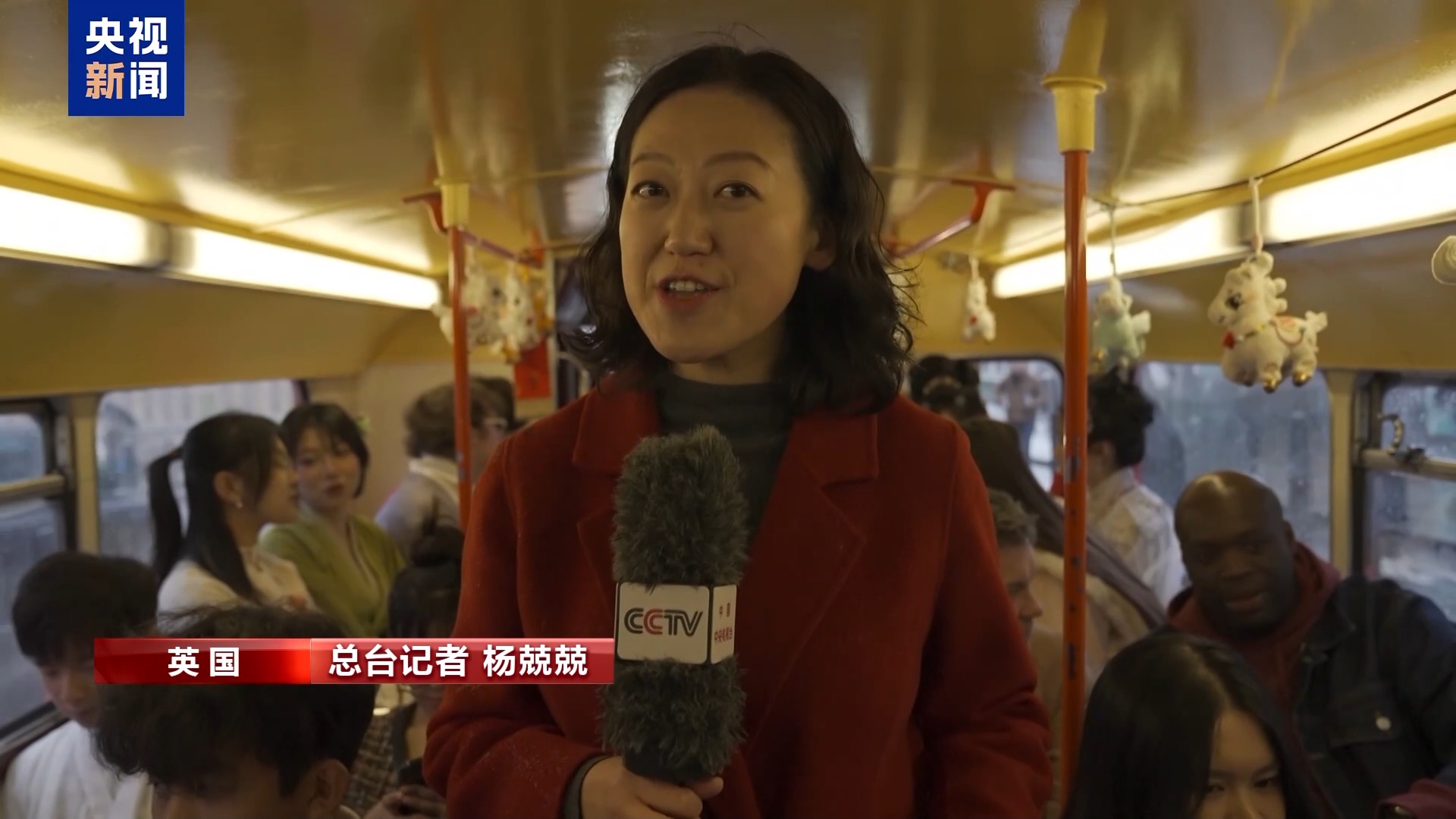 总台记者 杨兢兢:英国当地民众和游客不仅可以在大巴车外合影,还可以登上总台春晚主题大巴,观看总台马年春晚宣传片,参与竞猜游戏,赢取总台春晚文创奖品。