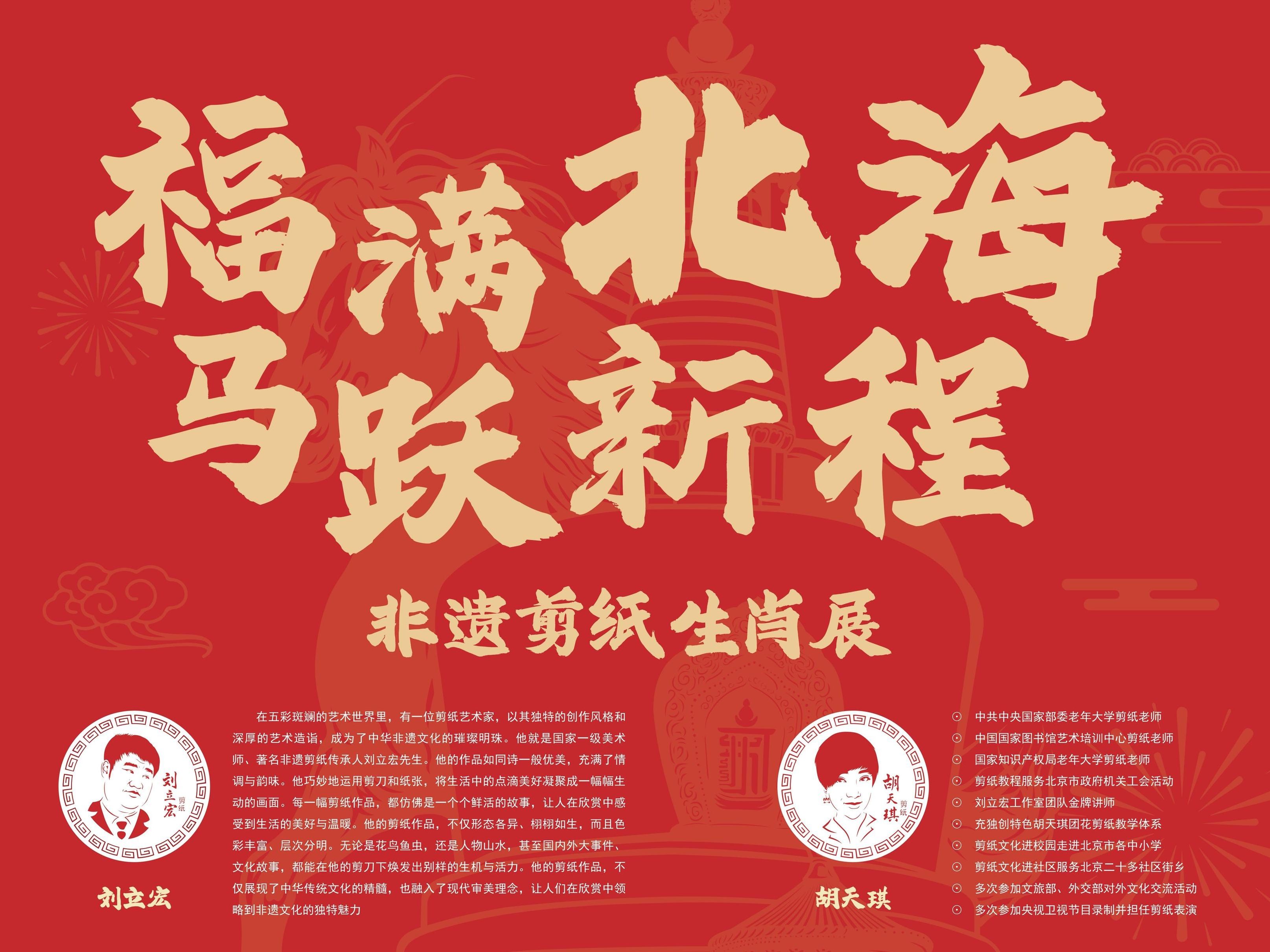 非遗剪纸大师刘立宏为北海公园设计马年特色剪纸作品联展。以“北海公园马上福来”“北海白塔印象”“北海白塔丙午大吉”三幅特别作品为亮点展出,展览位于北海公园东岸橱窗宣传栏。详情>>