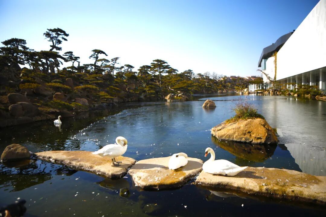 除了展览,馆区园林同样值得细赏。亭台水景、曲桥锦鲤……东方美学与现代设计交融,随手一拍都是质感大片。参观之余,不妨在黑天鹅蛋糕空间小坐片刻。精致甜品如艺术品般陈列,在优雅环境中品尝一份甜蜜,为假期增添仪式感。