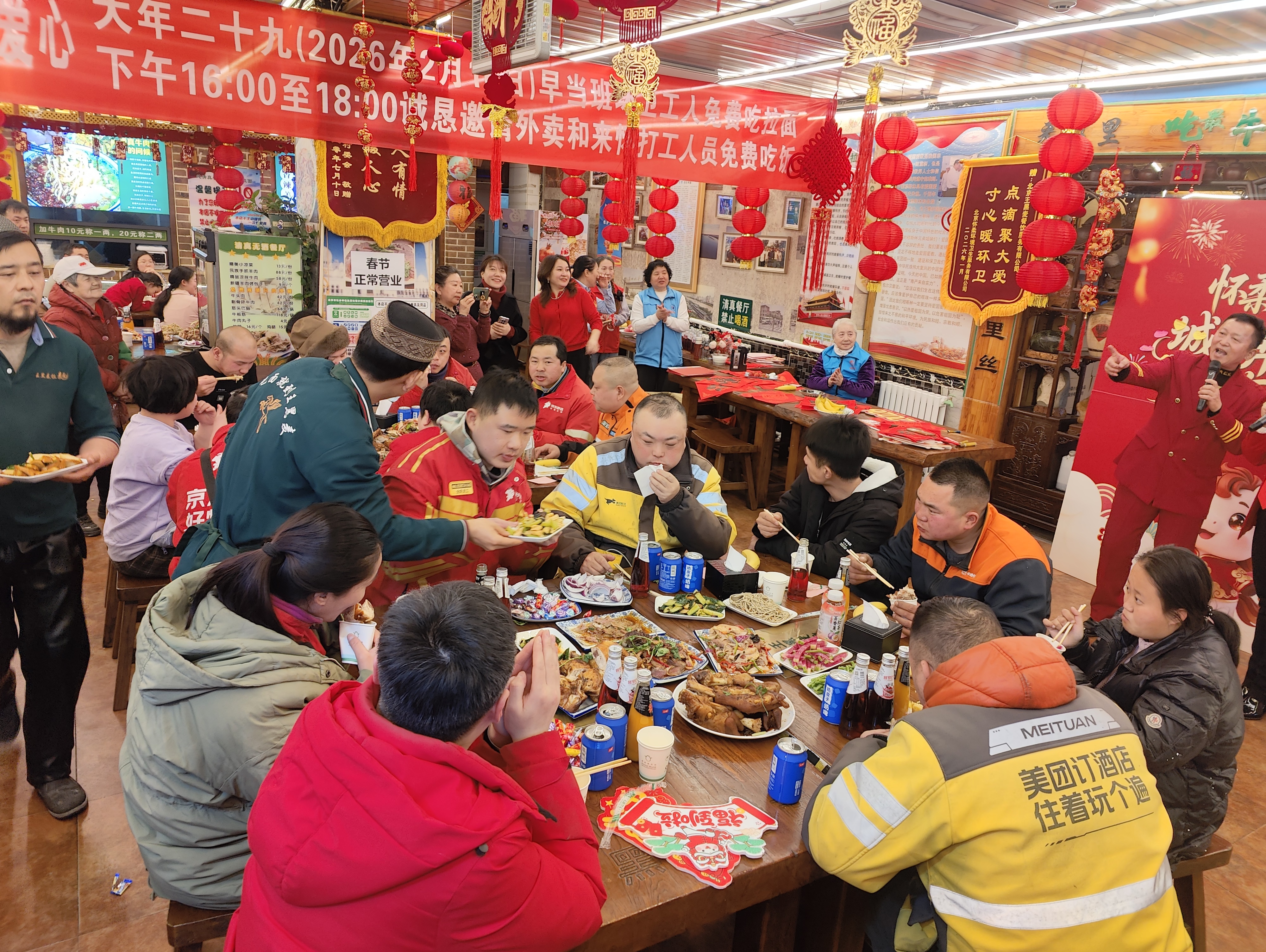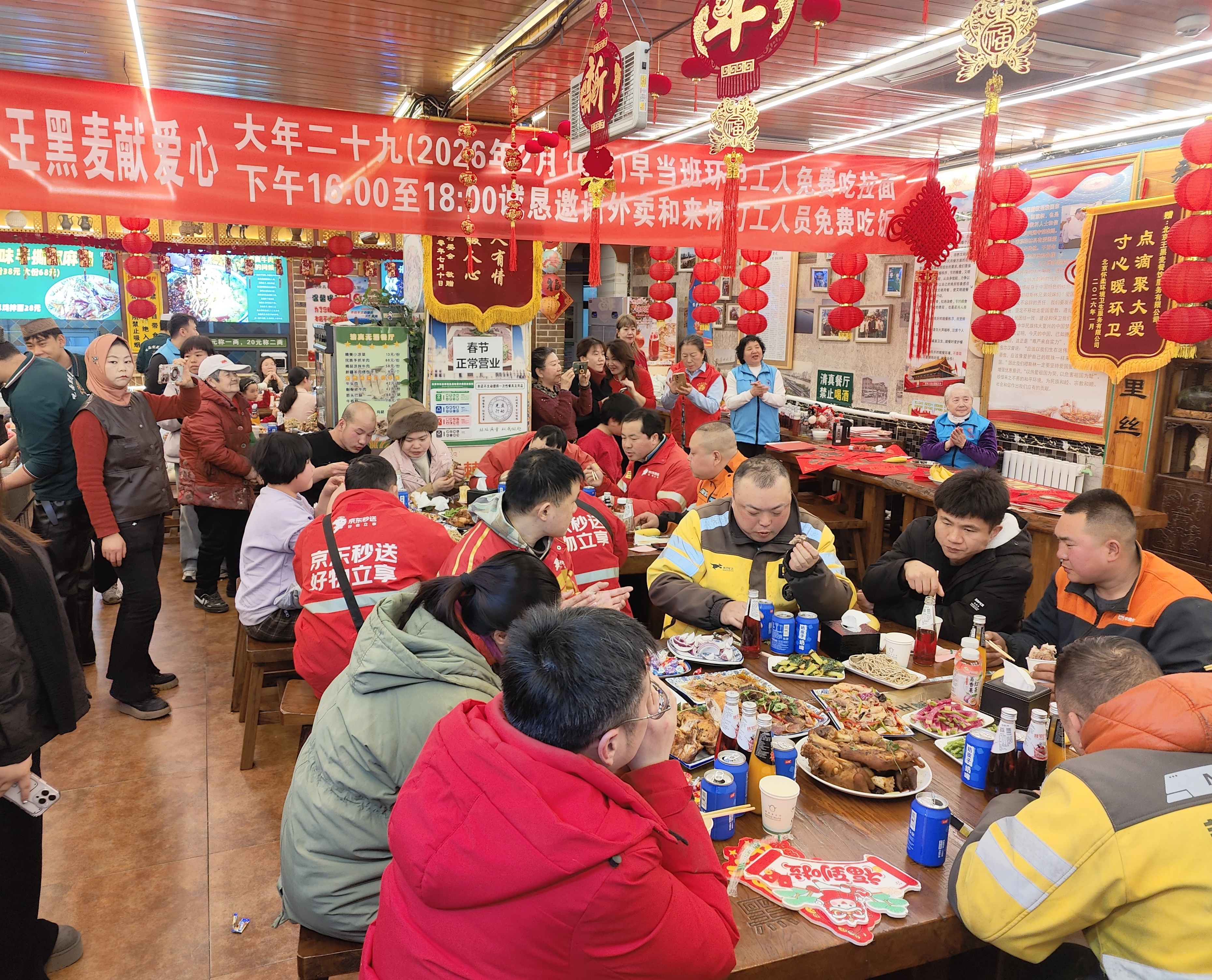 除夕夜,怀柔区东关二区的兰州王黑麦拉面馆里灯火通明、暖意融融。面馆没有打烊休息,而是把热气腾腾的年夜饭和一盏灯光留给了坚守岗位的城市劳动者——环卫工人、外卖小哥、留京打工人围坐一堂,热汤热饭、欢声笑语,吃出了团圆饭的味道。