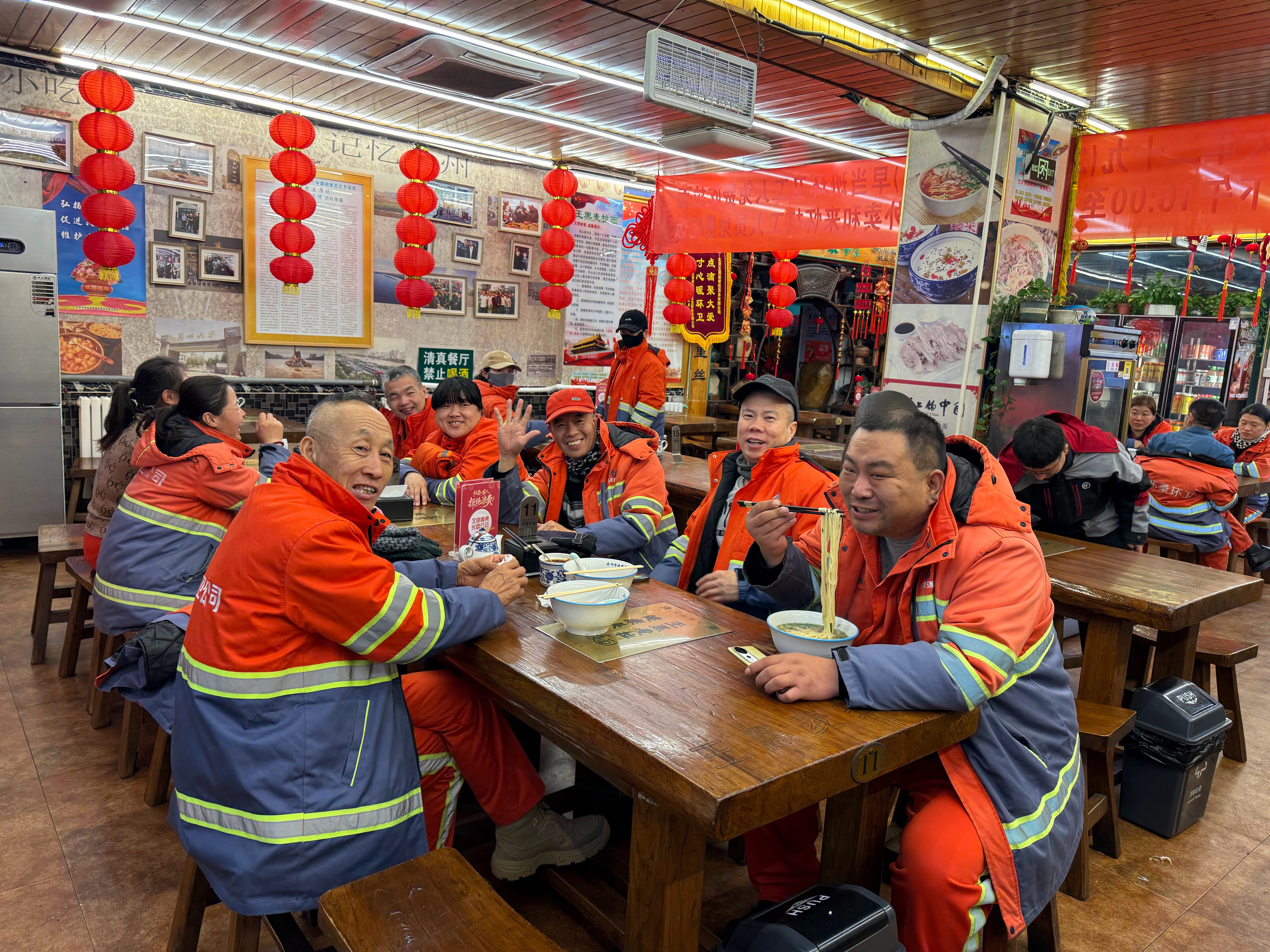 这份善意,面馆老板王黑麦已经默默坚持了6年。每到春节临近、天气最冷的时候,他都会为环卫工人送上1500张早餐卡,凭卡就能免费吃牛肉面,为凌晨扫街的他们驱散寒意。今年除夕,他把温暖做得更直接:环卫工人们到店就能免费吃面,不用卡、不麻烦,坐下就吃,管饱管好。