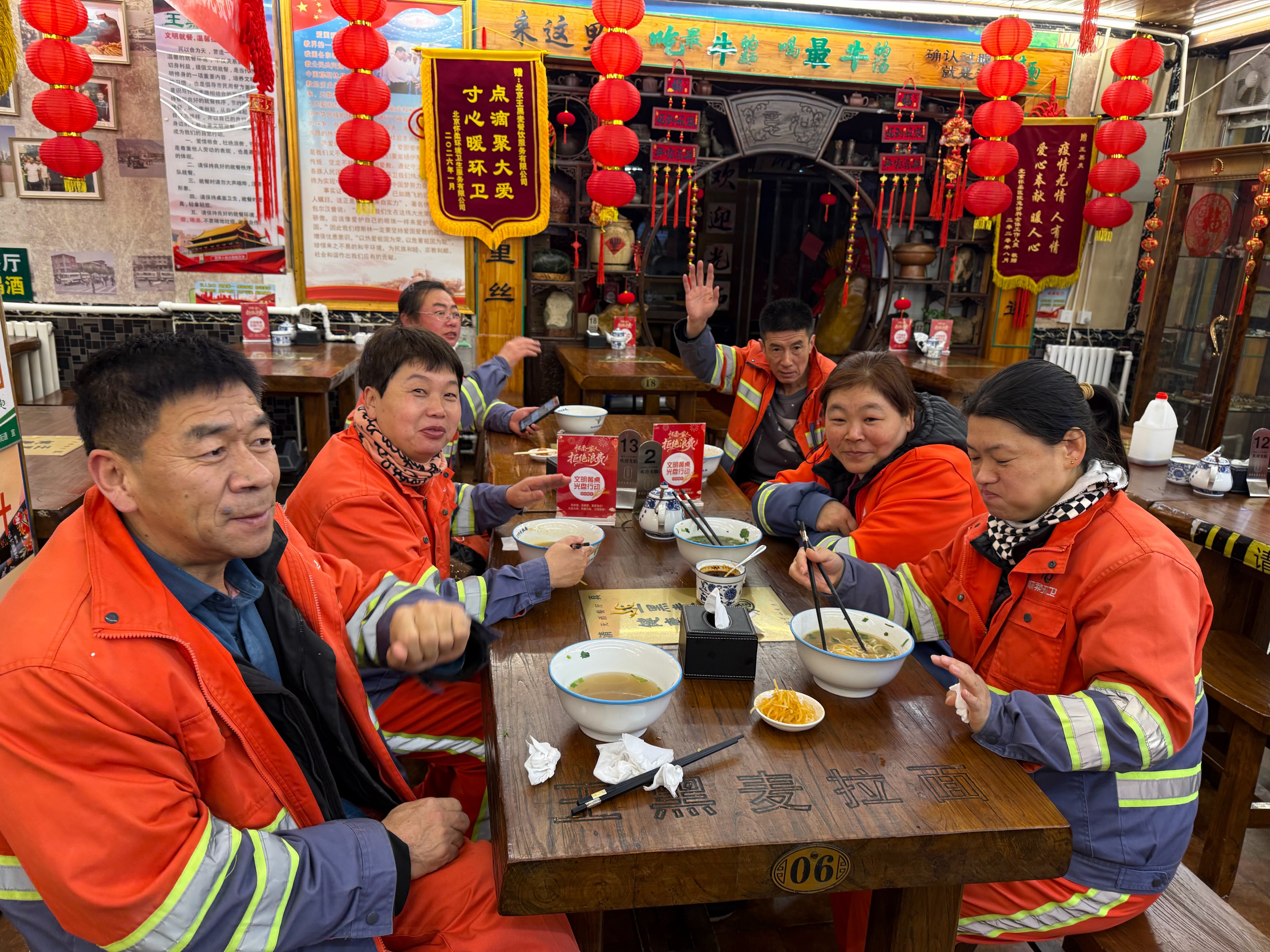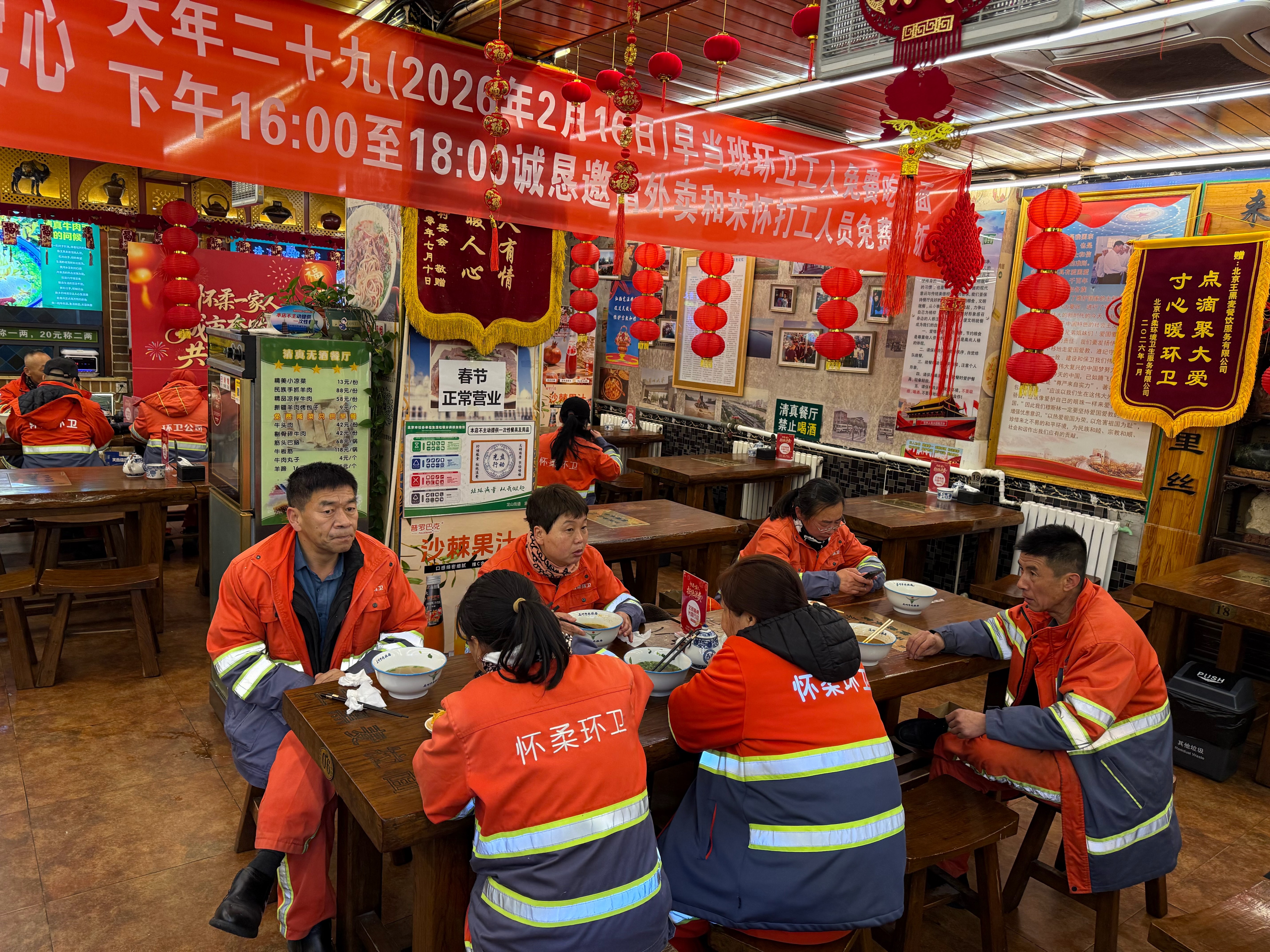 早在春节前,面馆内就挂上了暖心条幅:“大年二十九早班环卫工人免费吃拉面;下午4时至6时,诚挚外卖员和留京打工人免费就餐。”从清晨到日暮,一碗碗热气腾腾的拉面,成了这个冬天最动人的年味。