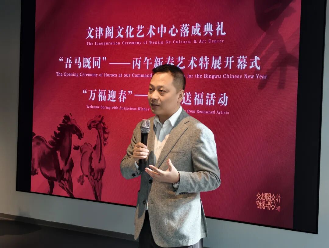 北京文津阁拍卖董事总经理、策展人王维,在现场为大家解读了展览主题的深意:“‘吾马既同’语出传世国宝《石鼓文》,其第一鼓《吾车鼓》,开篇第一句为‘吾车既工,吾马既同’,展现了车坚马壮的宏阔场面,是大国雄姿的极佳展现。我们以此为题,策划了这个马主题的艺术特展,以致敬这个伟大的时代。”