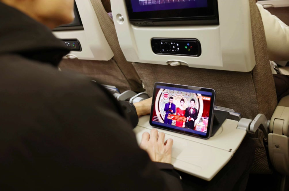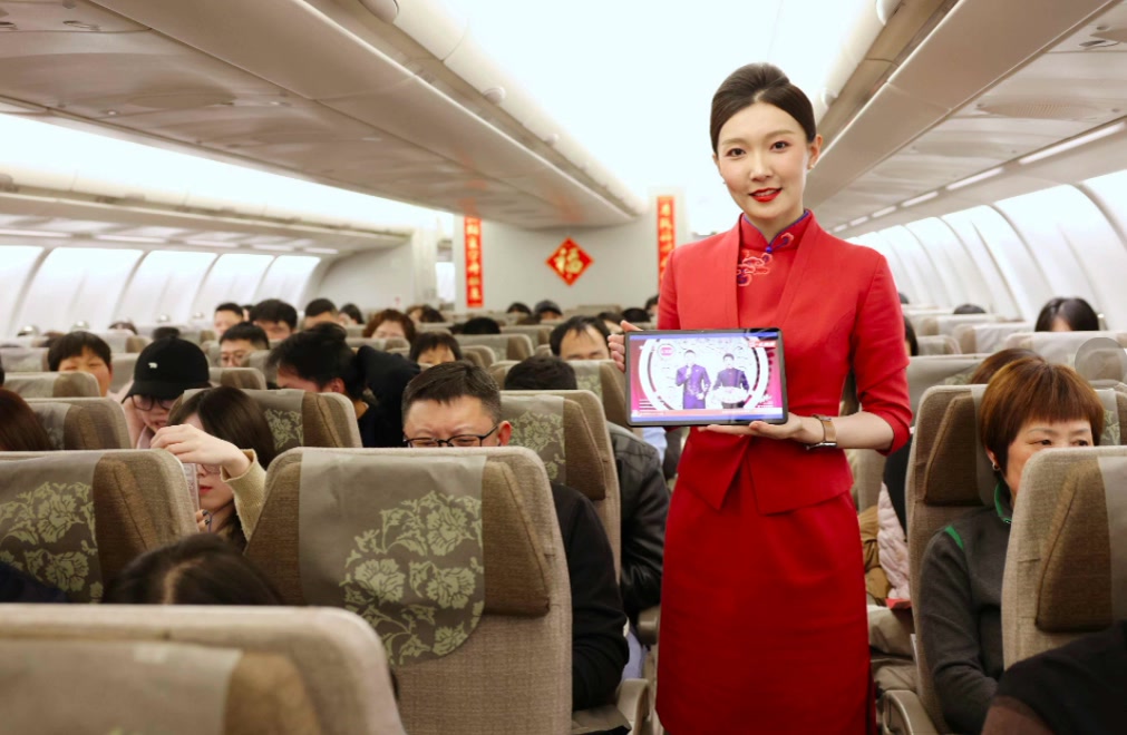 “‘锦绣中华‧和美之春’,今天是农历除夕,我们即将迎来马年新春。在这个充满美好与幸福的节日里,我们全体机组成员向您致以最诚挚的问候!为让旅途中的您不错过任何一个新春瞬间,在空中也能感受这份团圆与喜悦,本次航班特别提供全程免费高速Wi-Fi服务。欢迎您连接使用。”随着机上广播的新春祝福回荡客舱,当晚8时,主题航班从上海虹桥起飞前往北京首都,一场沉浸式的春节文化之旅正式开启。