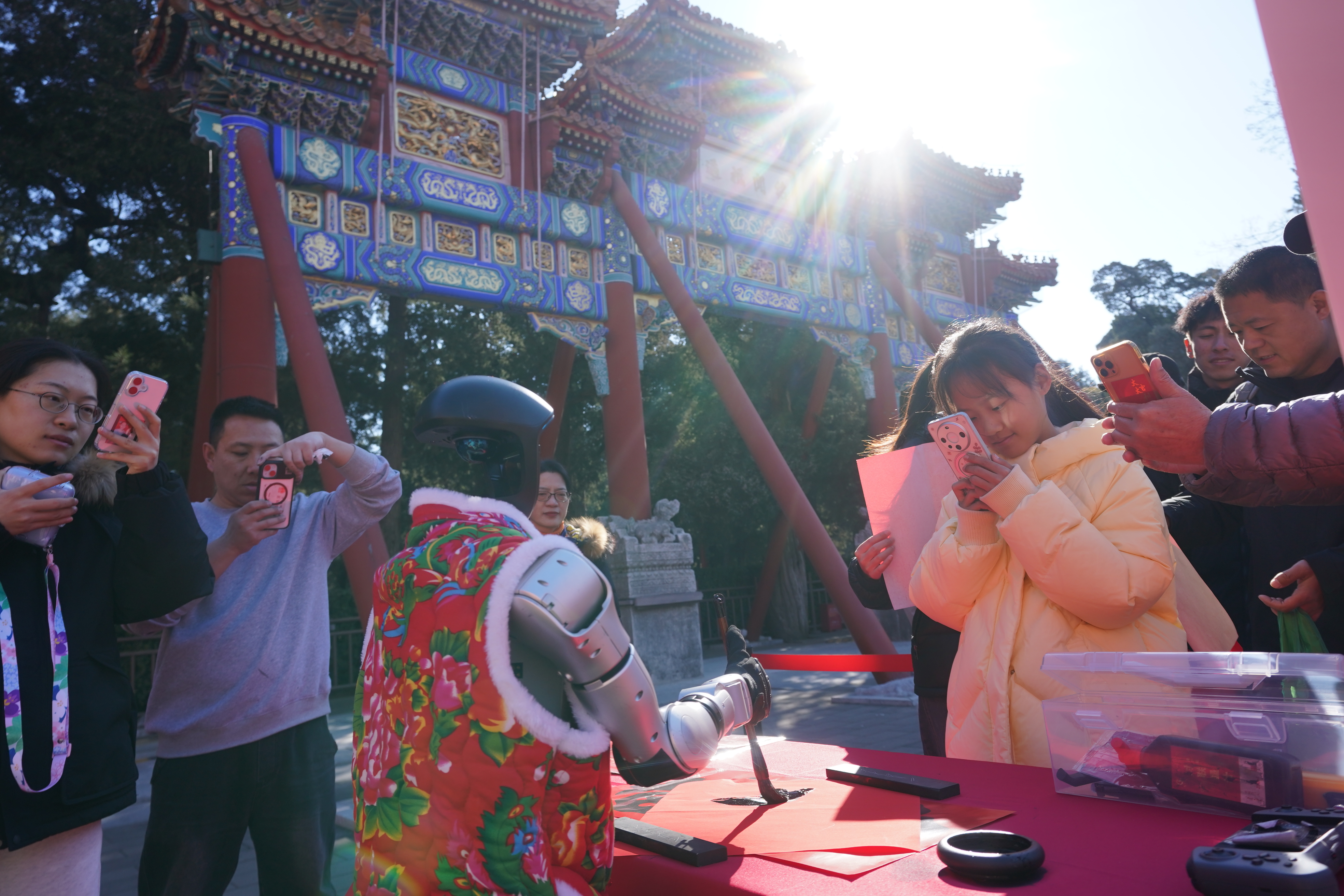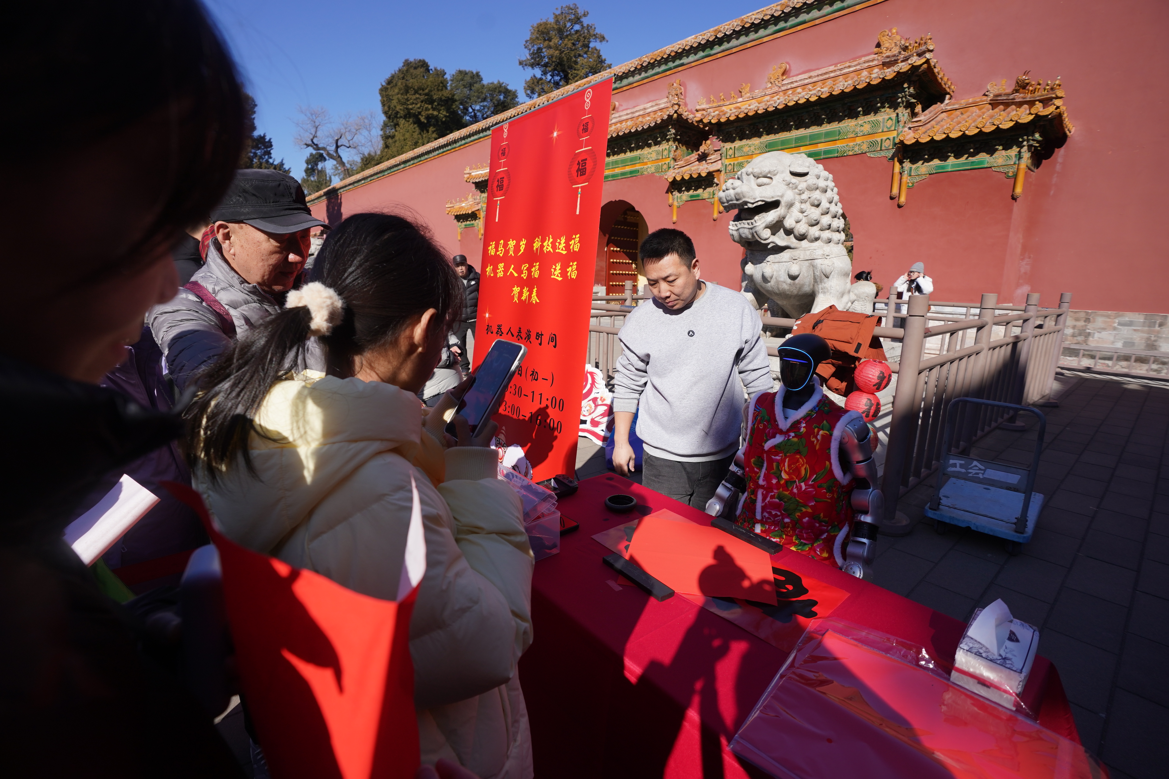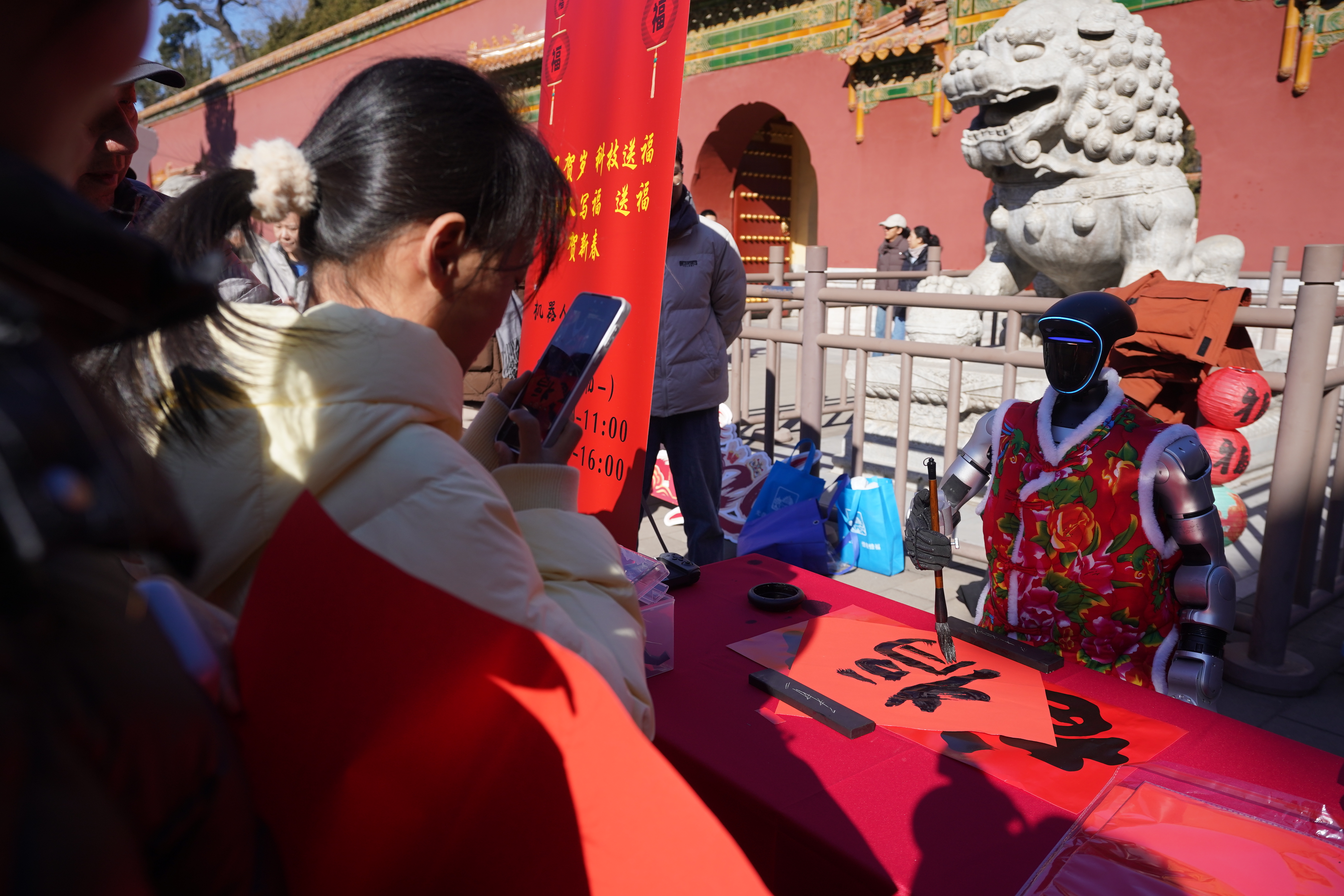 景山公园寿皇殿门前广场,机器人为游客现场书写福字。东门广场的文化市集吸引游客。