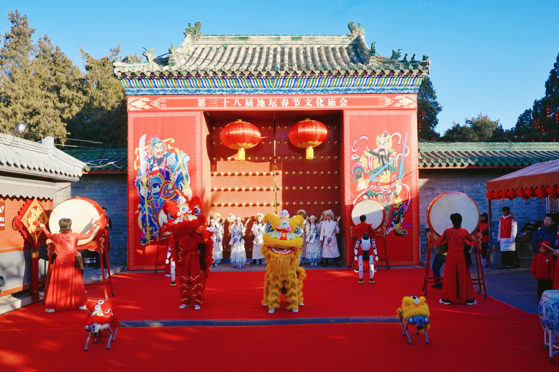 地坛庙会设有多处主题舞台,带来丰富多彩的演出。金马贺岁舞台位于北门广场周边,上演鼓舞、传统舞狮、民歌联唱、新编戏曲、非遗中幡等节目;东天门的民族共春舞台集中呈现魔术、杂技、变脸、京剧和梆子戏等艺术形式;北门钟楼附近的华彩未来舞台融合经典歌曲联唱、声音模仿秀、机器人表演等,展现传统与未来的交融。每天9时至9时30分,方泽坛还将举行仿古祭地表演,重现古代祈福仪式。此外,庙会现场汇集京味老字号、非遗手作、潮流文创及各地特色美食,并穿插老北京胡同叫卖巡游,绘就一幅流动的京城民俗画卷。