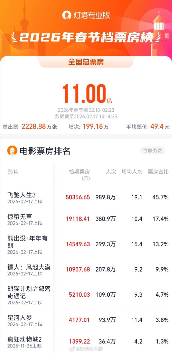 据灯塔专业版,截至2月17日14时14分,2026春节档(2月15日-2月23日),档期总票房(含预售)突破11亿。