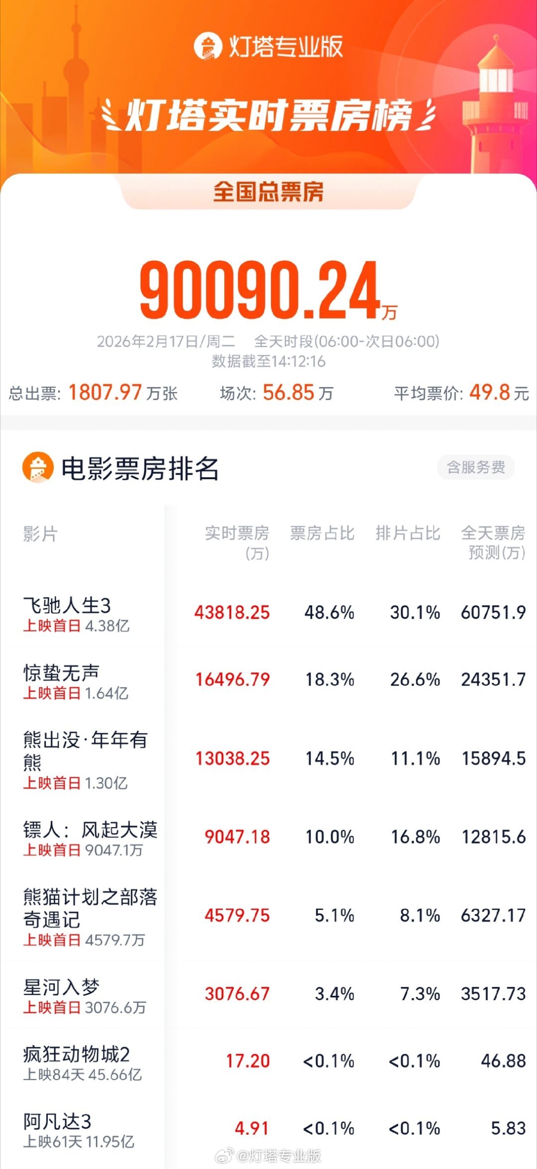 其中,截至2月17日14时12分,2026大年初一(2月17日)大盘票房突破9亿!