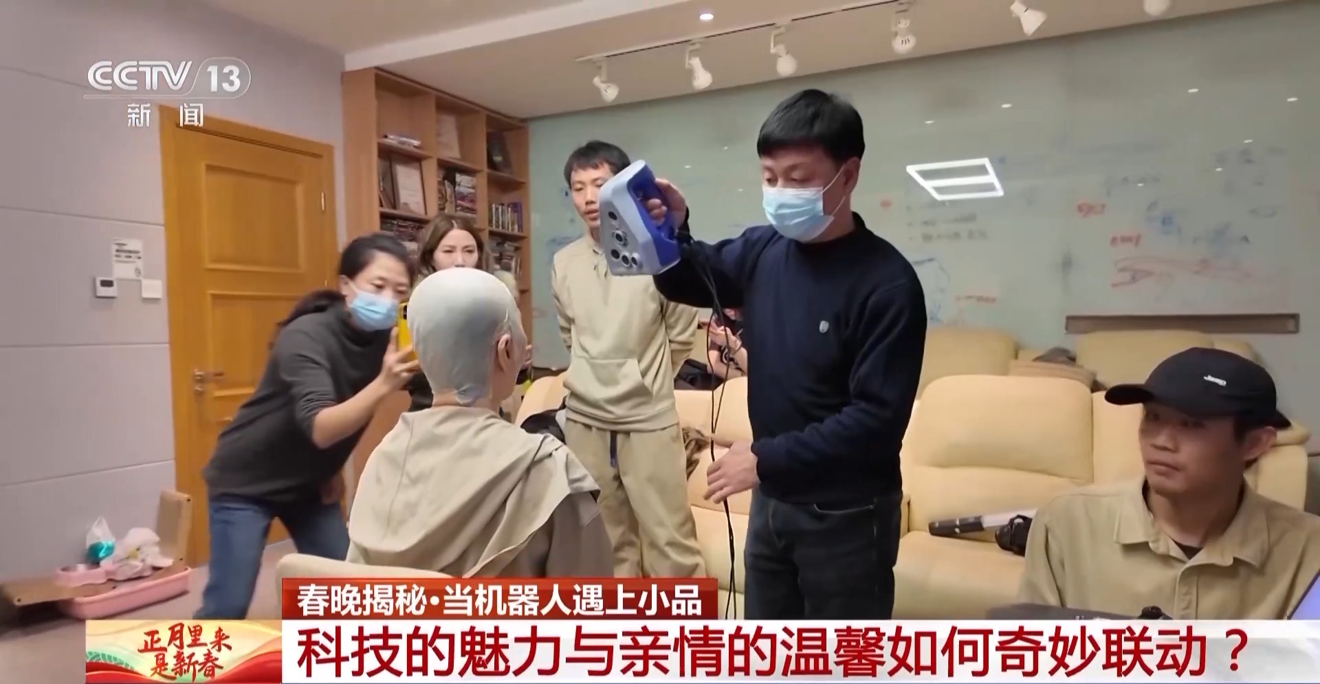 总台记者张河运:在我身边的这位,就是小品里出现的“假奶奶”,即便距离这么近,我都很难看出它和蔡明老师扮演的真奶奶有何不同,无论是发型、五官、妆造,甚至说话时面部的微表情都可以说是一模一样。
