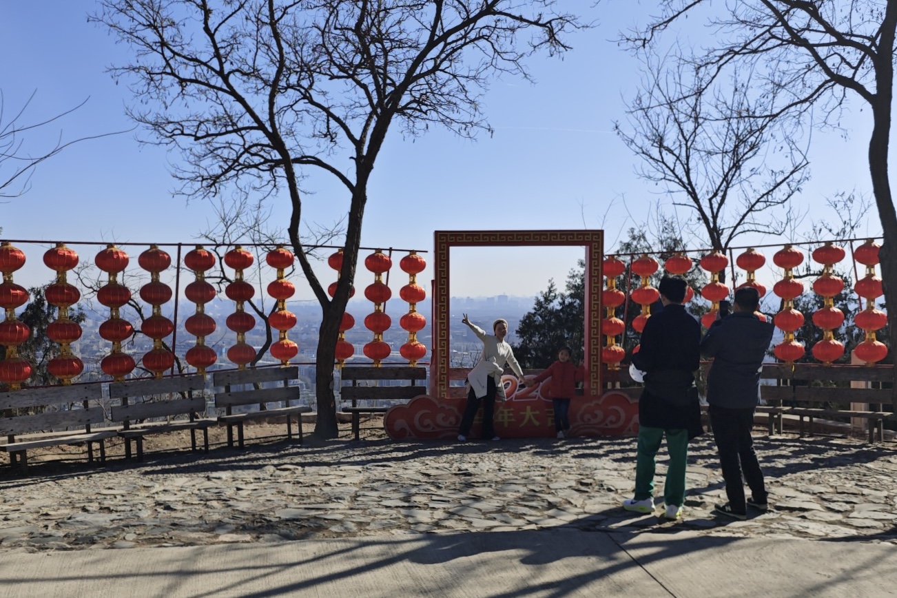 百望山森林公园,红灯笼高挂枝头,蜡梅香沁透晨风,以 “登高见福,踏香而来” 为特色,成为市民登高祈福、亲近自然的好去处。碑亭广场前,一座重檐门洞飞檐翘角,穿过去便是“穿福门,纳吉祥”的美好寓意;太行前哨石碑旁,“马年大吉” 四个金字熠熠生辉,老地标焕发新光彩;半山腰的相框两侧灯笼层层叠叠,框住的是团圆,框不住的是满眼的笑意;山顶的 “福”“寿” 二字更成为游客登高打卡的必到之处,山风拂面间,满是福寿双全的美好期许。