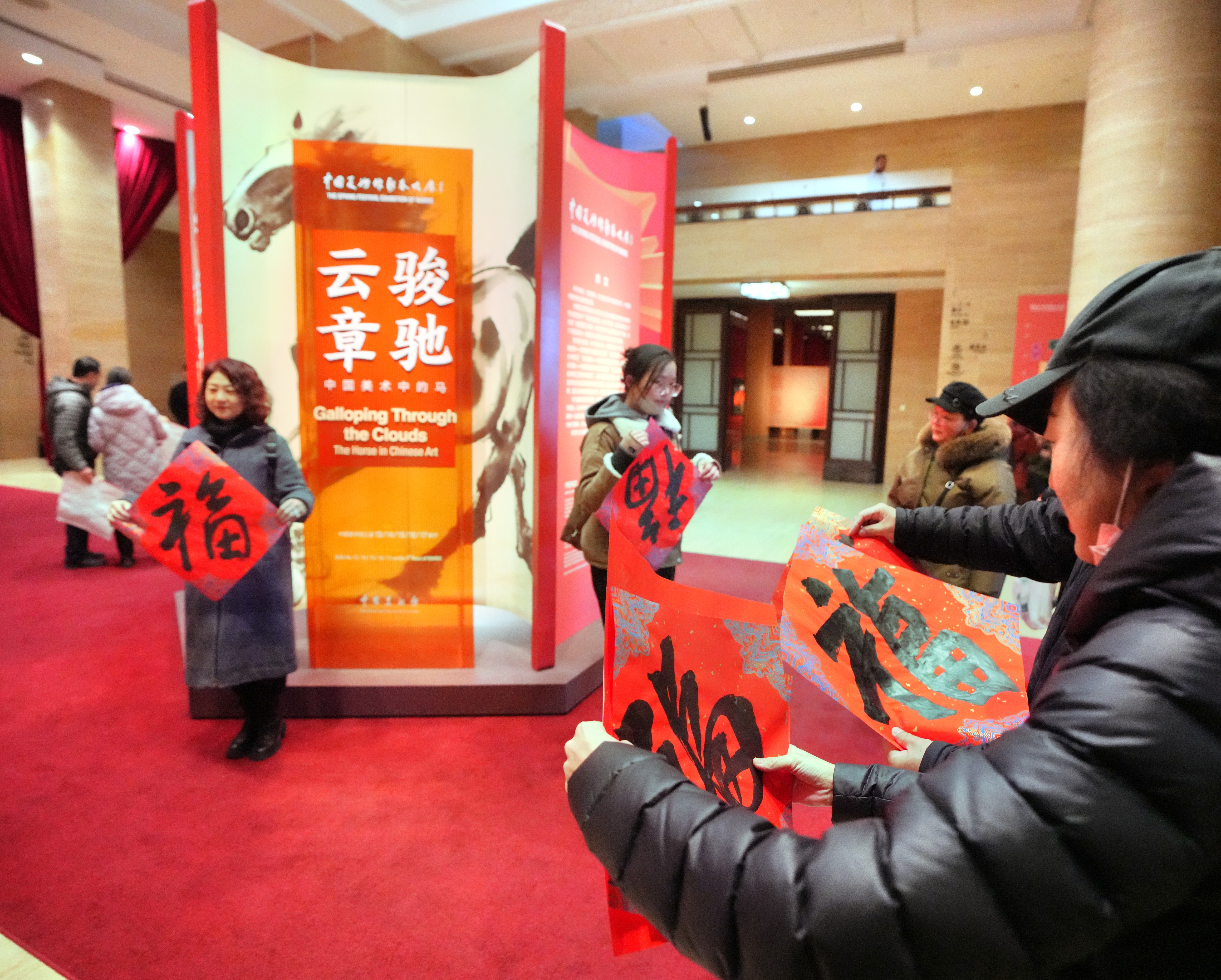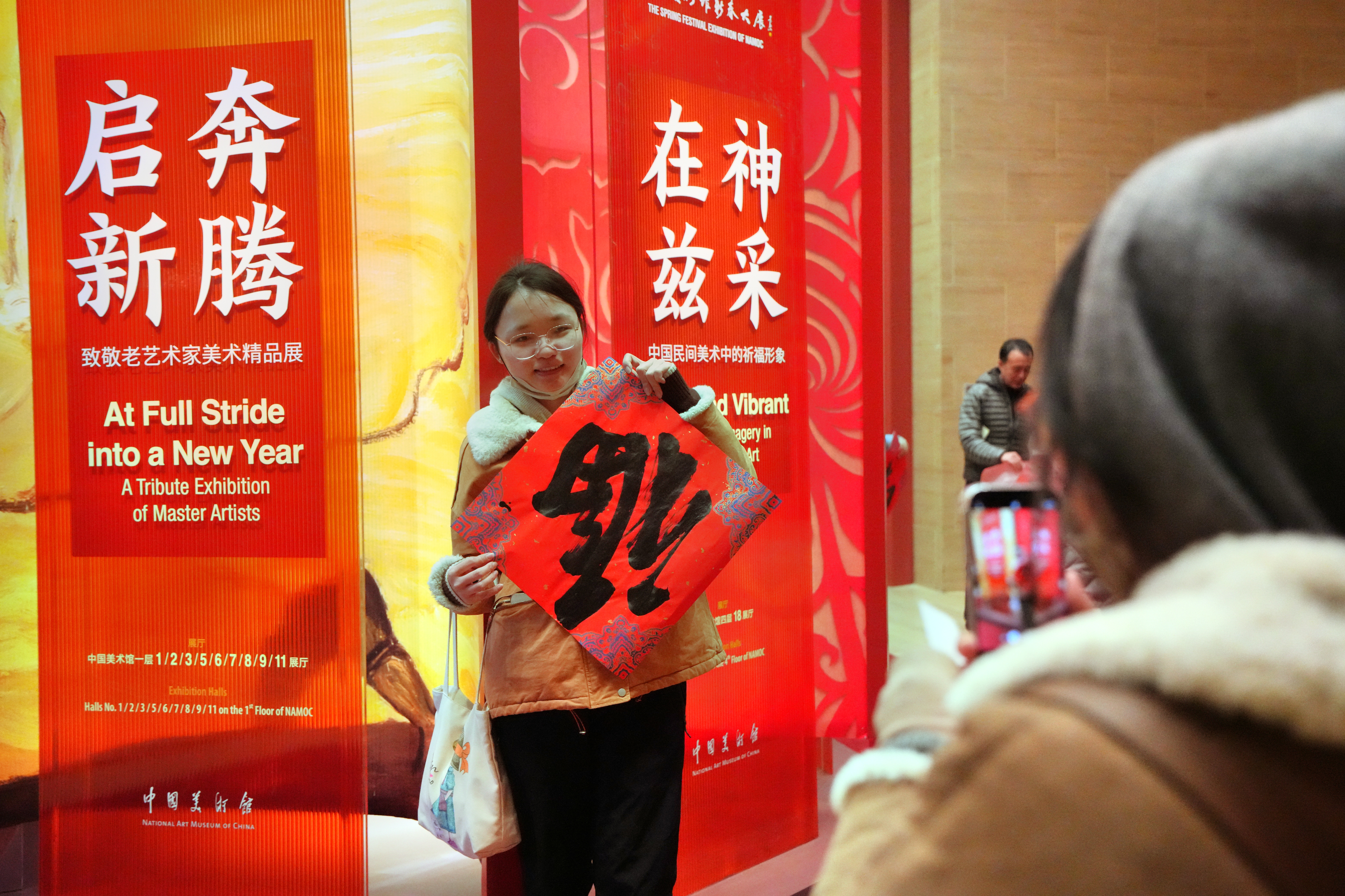 接过“福”字,大家纷纷拍照留念,每个人都绽放出最美笑容。带着“福”字,观众不约而同走进展厅,开启一场新春艺术之旅。当天,馆内六大精品展览同步开放,并持续至3月8日,五大主题展可谓各具匠心:一层“奔腾启新——致敬老艺术家美术精品展”汇聚129位艺术家约250件作品,致敬老一辈艺术家的赤诚与坚守;“跃马春风”楹联书法展展出40件(套)佳作,墨韵间尽显骏马风采;“瑞器呈华”工艺美术精品展则以匠心之作,呈现中华工艺的瑰丽神采。三层“骏驰云章——中国美术中的马主题展”紧扣马年主题,展现骏马昂扬之气;四层“神采在兹”民间美术祈福形象展,传递新春吉庆祥和;藏宝阁小幅经典作品展,于方寸之间尽展中华文脉悠长。