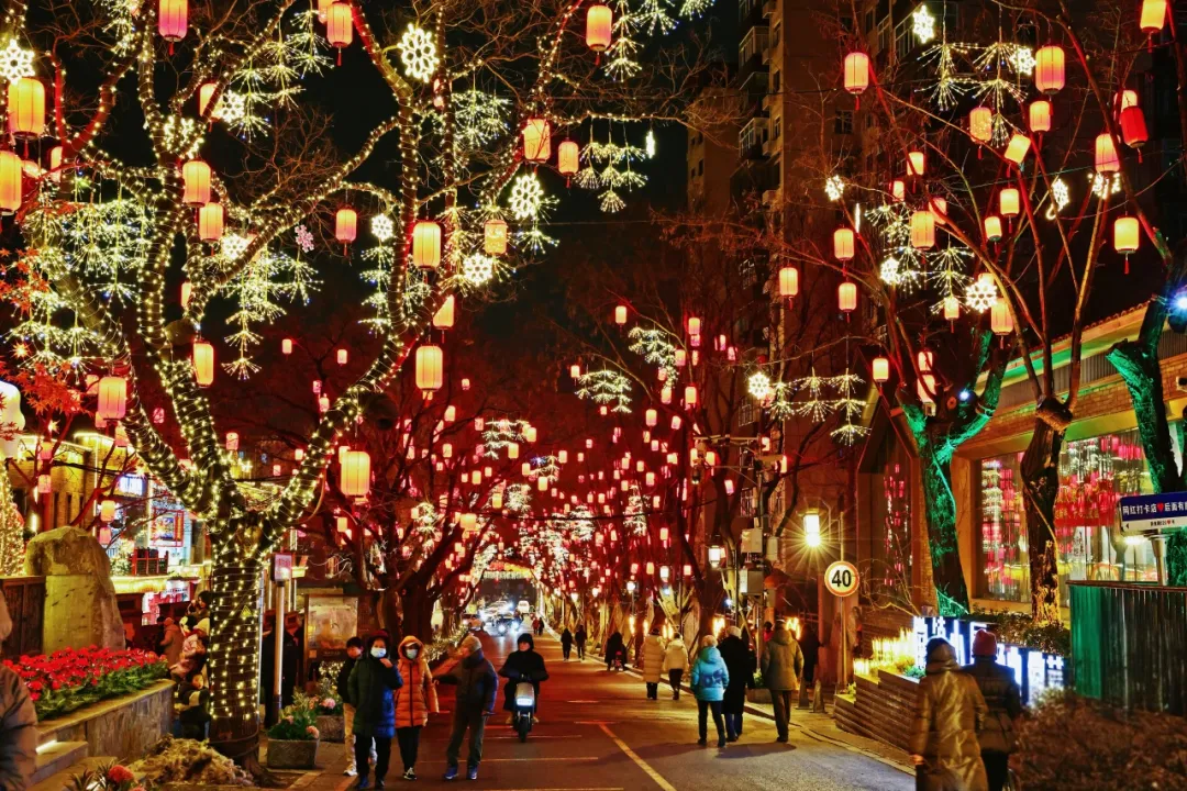 待到华灯初上,模式口历史文化街区迎来最美时刻。盏盏红灯笼、雪花灯与主题灯组沿古道铺展,“瑞马迎春”灯组昂首扬蹄,“摩登雪夜”灯景浪漫出片,蓝调时刻的天空与红灯笼相映,驼队穿行的光影场景仿佛穿越千年时空,幻化成京西夜景最动人的模样。