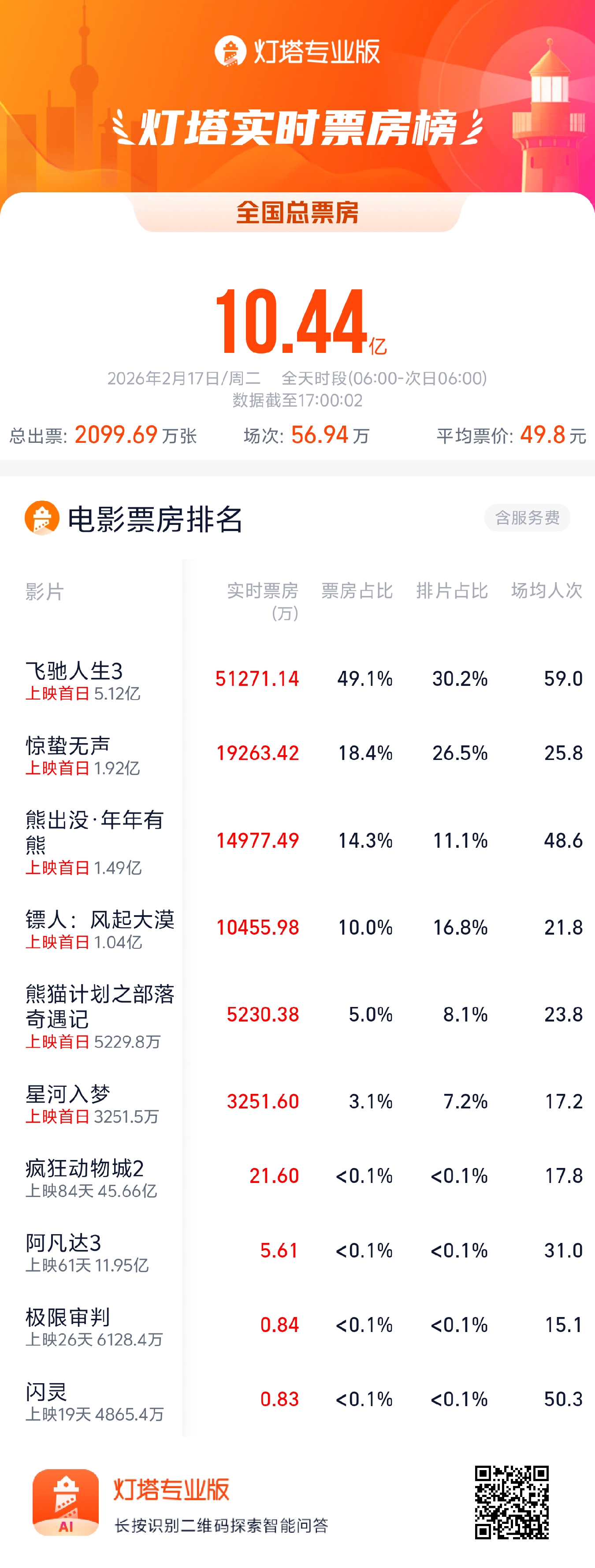 根据大麦娱乐旗下灯塔专业版数据显示,截至2月17日17时,2026年大年初一(2月17日)大盘票房已突破10.44亿元,春节档(2月15日-2月23日)档期总票房(含预售)突破12.67亿元。《飞驰人生3》单日票房突破5亿元,“一马当先”领跑春节档票房榜,贡献大盘近5成票房;《惊蛰无声》《熊出没·年年有熊》《镖人:风起大漠》分列初一票房榜前四名,并且单日票房均已突破1亿元。