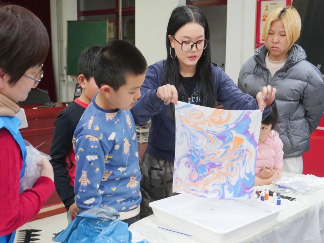 旺泉街道西辛第一社区·社区青年汇则为青少年们带来了一场别开生面的非遗体验——水拓画丝巾制作活动。老师耐心讲解水拓画的历史渊源与制作技巧,孩子们将颜料轻轻滴入水面,以工具勾勒,色彩随水纹自然晕染,再将丝巾轻覆其上,一幅幅独一无二的水中画卷便被定格于丝巾之上。