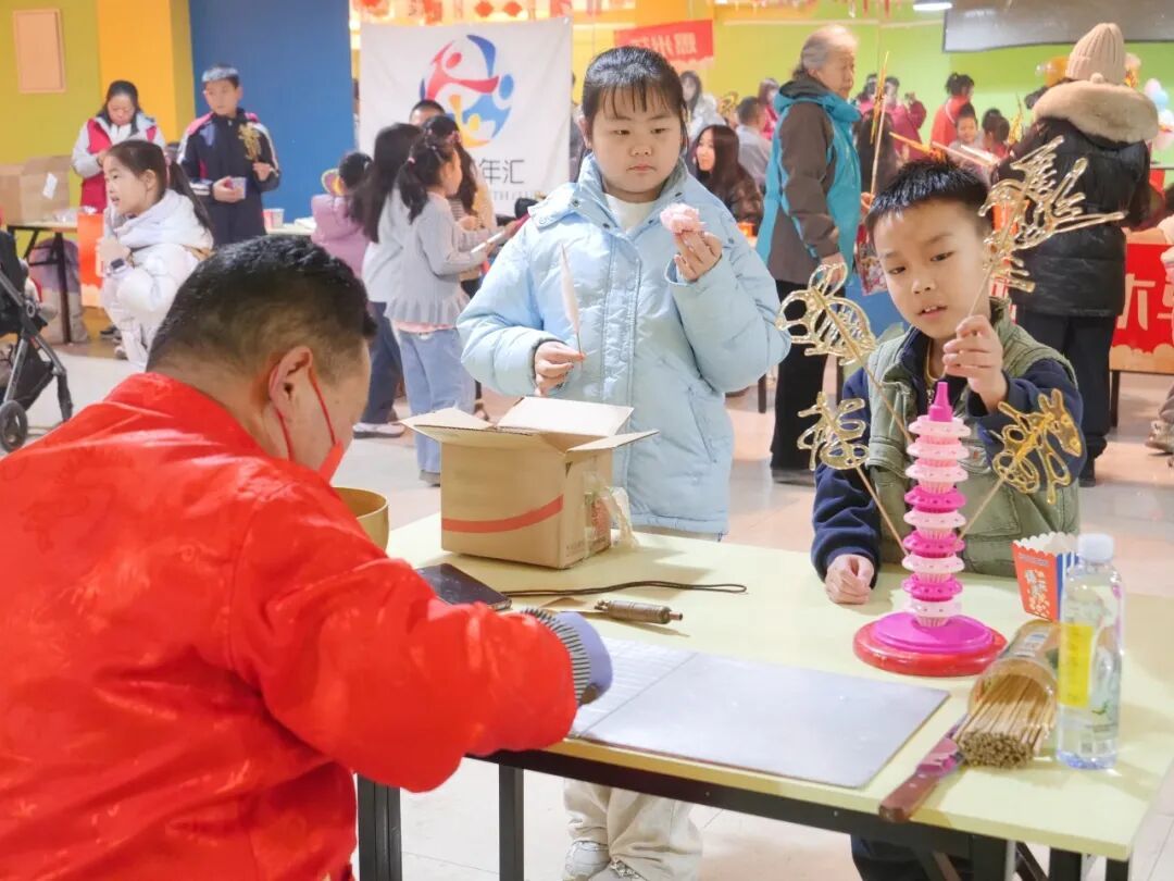 走进光明街道裕龙三区·社区青年汇,一场新春游园会正在热闹举行。孩子们在家长的陪伴下,制作花灯、老北京风车,品尝糖画、糖人,体验传统民俗的魅力,浓浓的年味儿在指尖流转、在陪伴中升温。