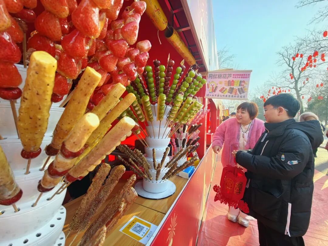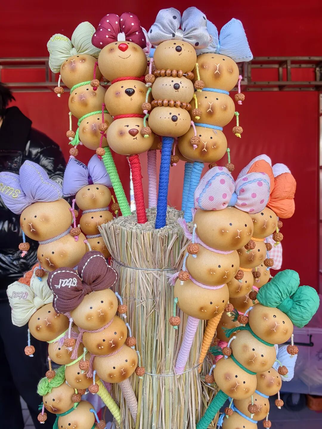 走到龙潭公园北门东侧的年礼区,竹木悦东方摊位售卖的葫芦叠叠乐呆萌极了,三个葫芦被串成一串,圆滚滚的身子被画上了俏皮的表情,戴着蝴蝶结、挂着小核桃的装饰,像一串串可可爱爱的糖葫芦,凭借“葫芦”谐音“福禄”的寓意,让游客忍不住想把这份可爱和好运带回家。