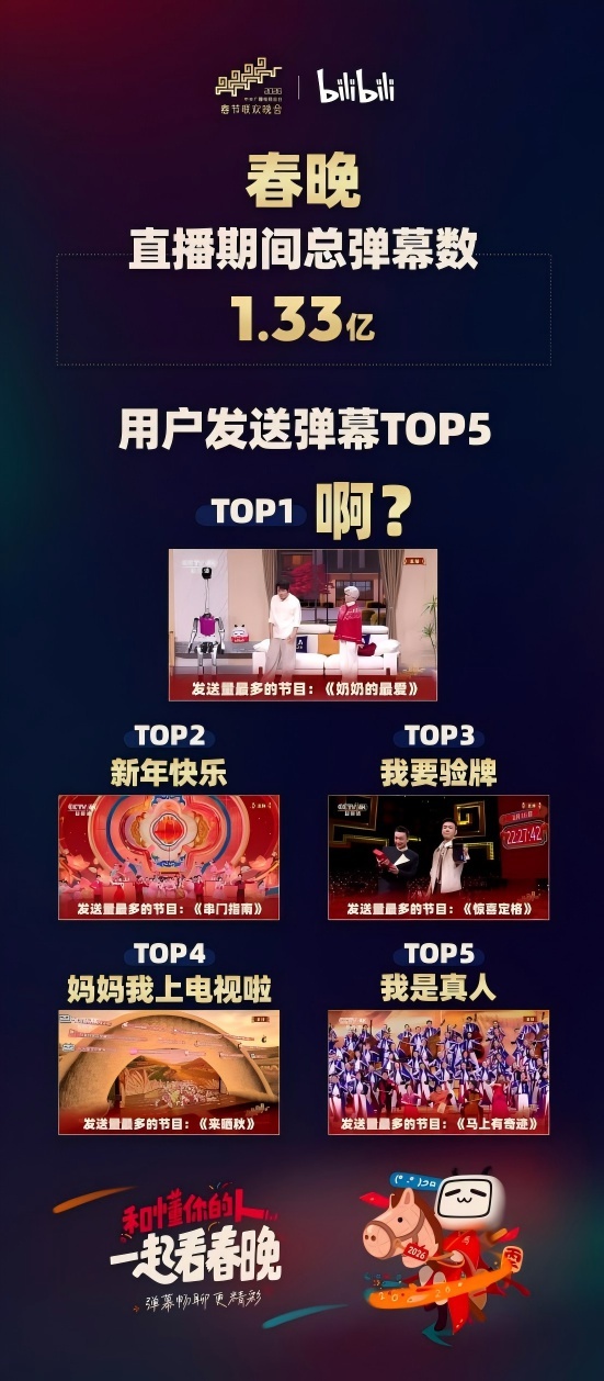 B站作为马年总台春晚的独家弹幕视频平台,2月16日春晚直播期间,B站弹幕总数达1.33亿,平均每秒发送7700条。发送数量排名前五的弹幕分别是:“啊?”“新年快乐”“我要验牌”“妈妈我上电视了”“我是真人”。其中,“啊?”主要集中在蔡明、王天放表演的节目《奶奶的最爱》。这是B站与总台春晚的二次合作,上B站发弹幕看春晚,已经成为年轻人在除夕夜的重要仪式。