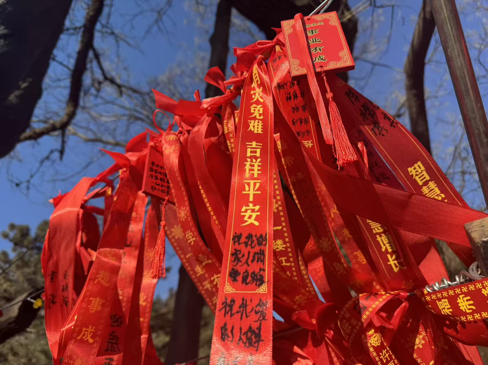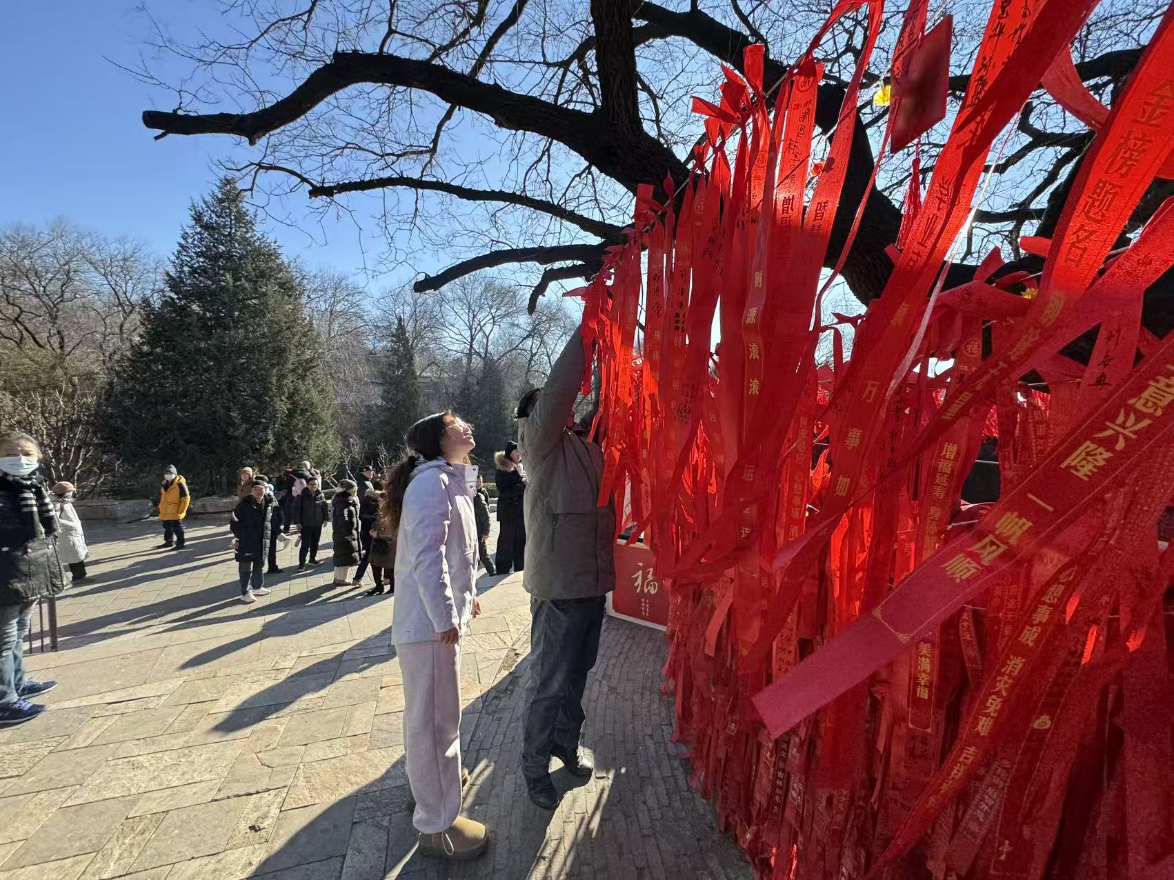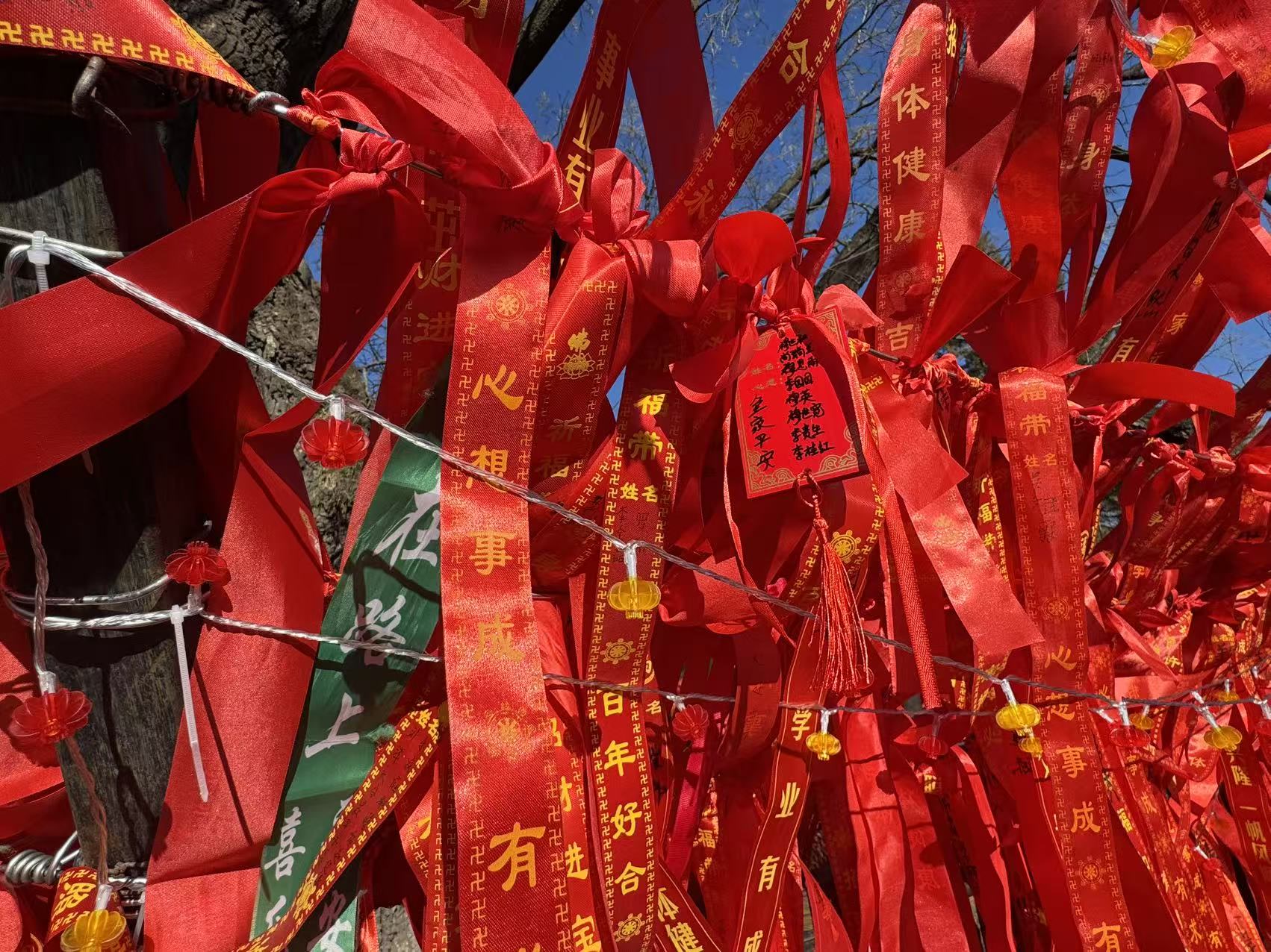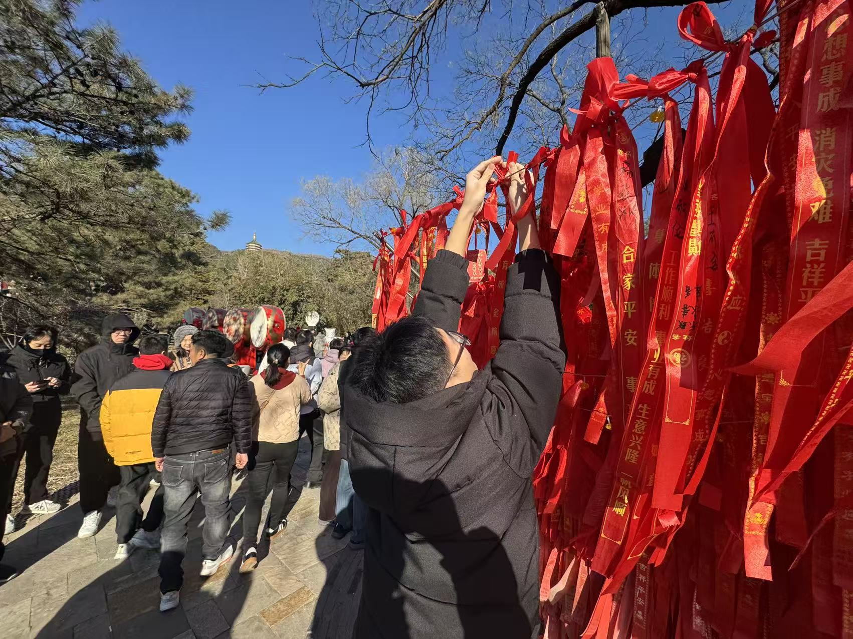 登山口旁一株高大的国槐下,人头攒动,不少市民竞相用红绸带悬挂起新年祈愿。年轻的父母握着孩子的手写下“健康成长”,情侣各自写一半凑成“长相厮守”,每一条红绸背后,都有着温暖的故事。