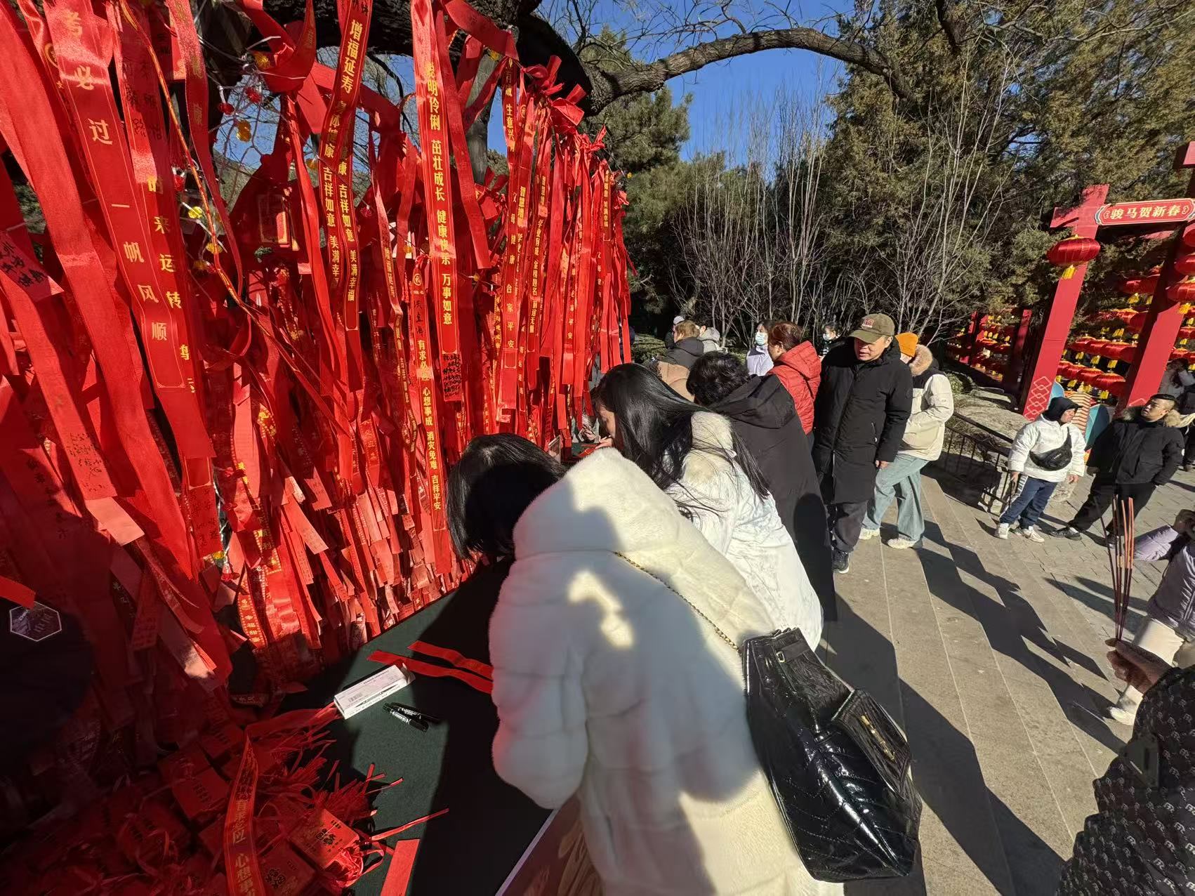 “手机发祝福太便捷,反倒少了几分仪式感,今天我要慢慢写,把心意都藏在字里。”市民陈雨桐精心挑选了一条合家平安的祈福带,一笔一画写下全家人的姓名,郑重地系在枝头。“手写的祝福,才有温度。”市民林悦细细斟酌,在绸带上落笔写下“愿所求皆如愿,所行皆坦途”,娟秀的字迹旁,还画上了一匹灵动的小马,珍藏下一份独属于马年新春的美好记忆。