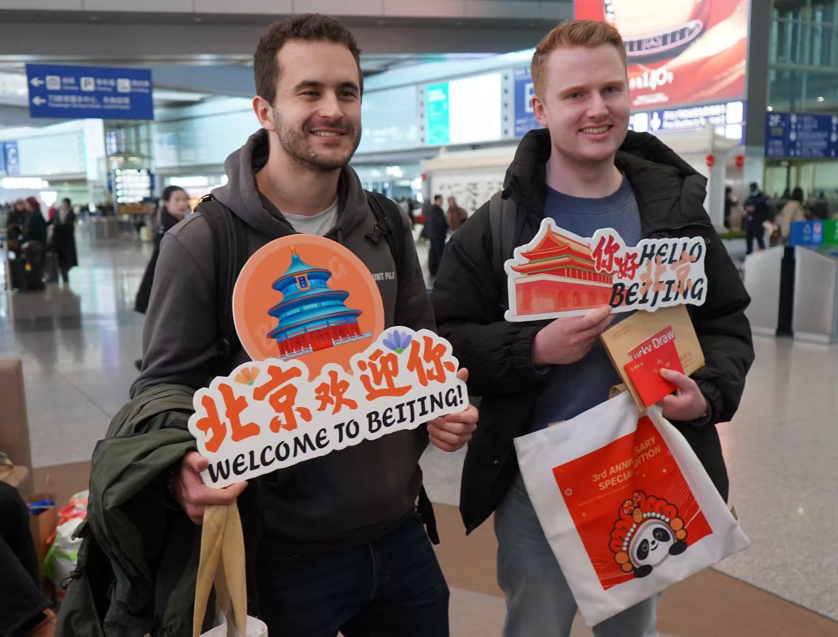 为深化中英人文交流、促进民心相通,北京市文化和旅游局联合中国驻伦敦旅游办事处、中国国际航空公司伦敦营业部、中旅旅行,于2月15日晚在伦敦希思罗机场,为搭乘国航CA938航班的旅客举办温馨送行仪式,为来京外国旅客送上新春诚挚祝福。2月16日除夕当天,该航班顺利抵达北京首都机场T3航站楼,市文化和旅游局在机场“北京服务”柜台开展迎接活动,为抵京外国游客送上新春大礼包,内含大都新春庙会游览门票、梨园剧场戏票、精品入境旅游线路折页,以及中旅旅行赞助的北京一日游产品、全聚德烤鸭双人套餐等新春礼遇,更好地让外国游客感受北京年味。市文化和旅游局相关负责人介绍,此次“送迎联动”活动,是落实中英两国领导人共识、深化双边人文交流的创新实践。为进一步便利中外人员往来,中方决定自2026年2月17日起,对加拿大、英国持普通护照人员实施免签政策。免签政策的落地将极大降低英国旅客来京出行门槛,为中英文旅交流注入更强动力。