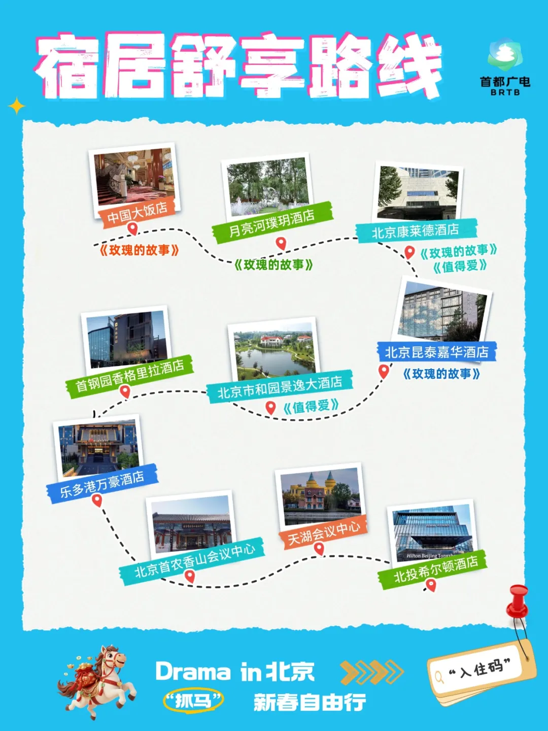 近期,北京市广电局推出了“跟着‘北京大视听’游北京”系列12条影视取景地打卡路线。Drama(抓“马”)in北京,新春自由行。让您在一场“抓马”游戏中开启新春京城之旅。那么今天我们要抓的是——“入住码”!带您一边享受愉快假期,一边打卡影视名场面,这条“宿居舒享路线”快快码住吧~