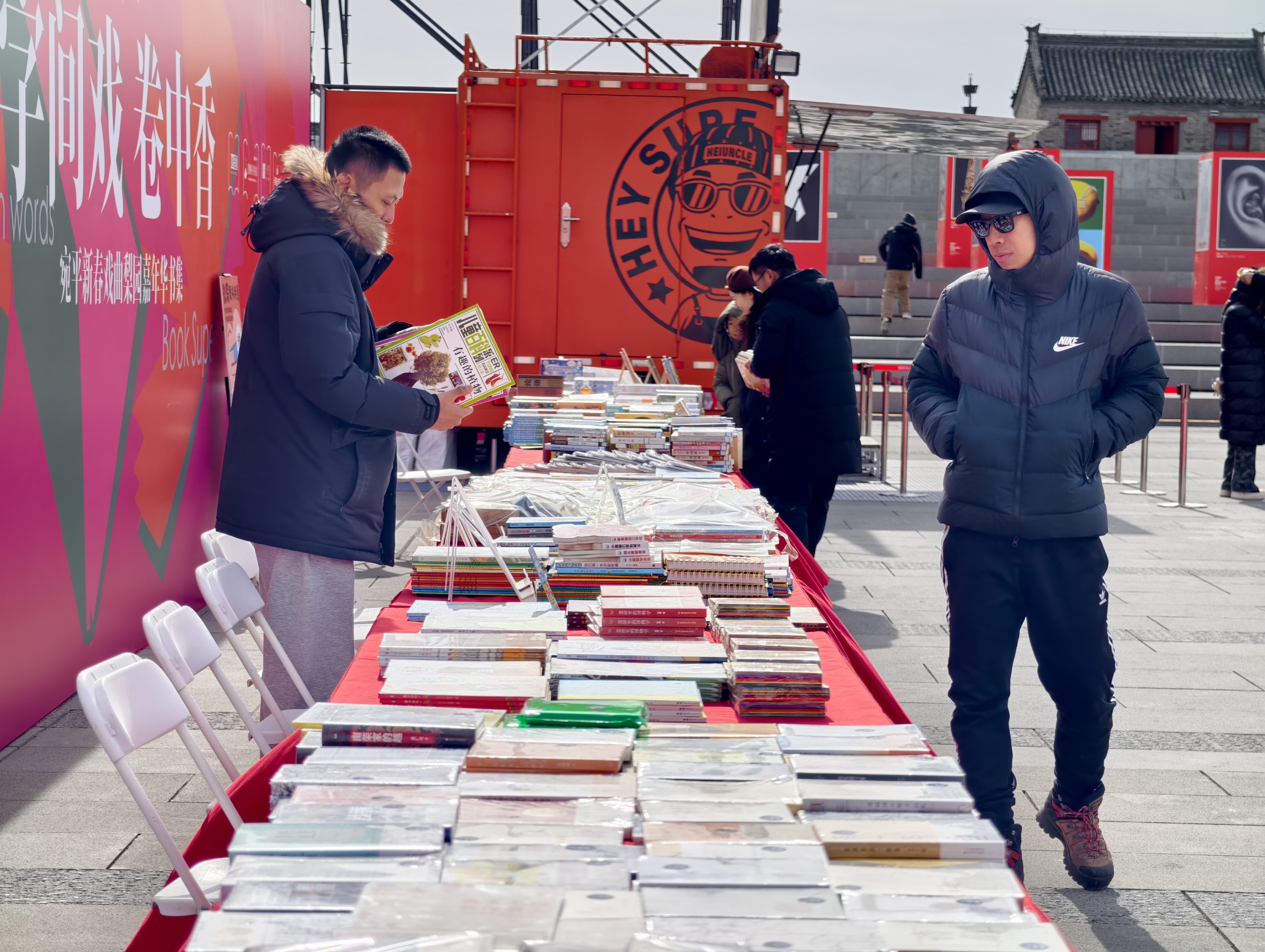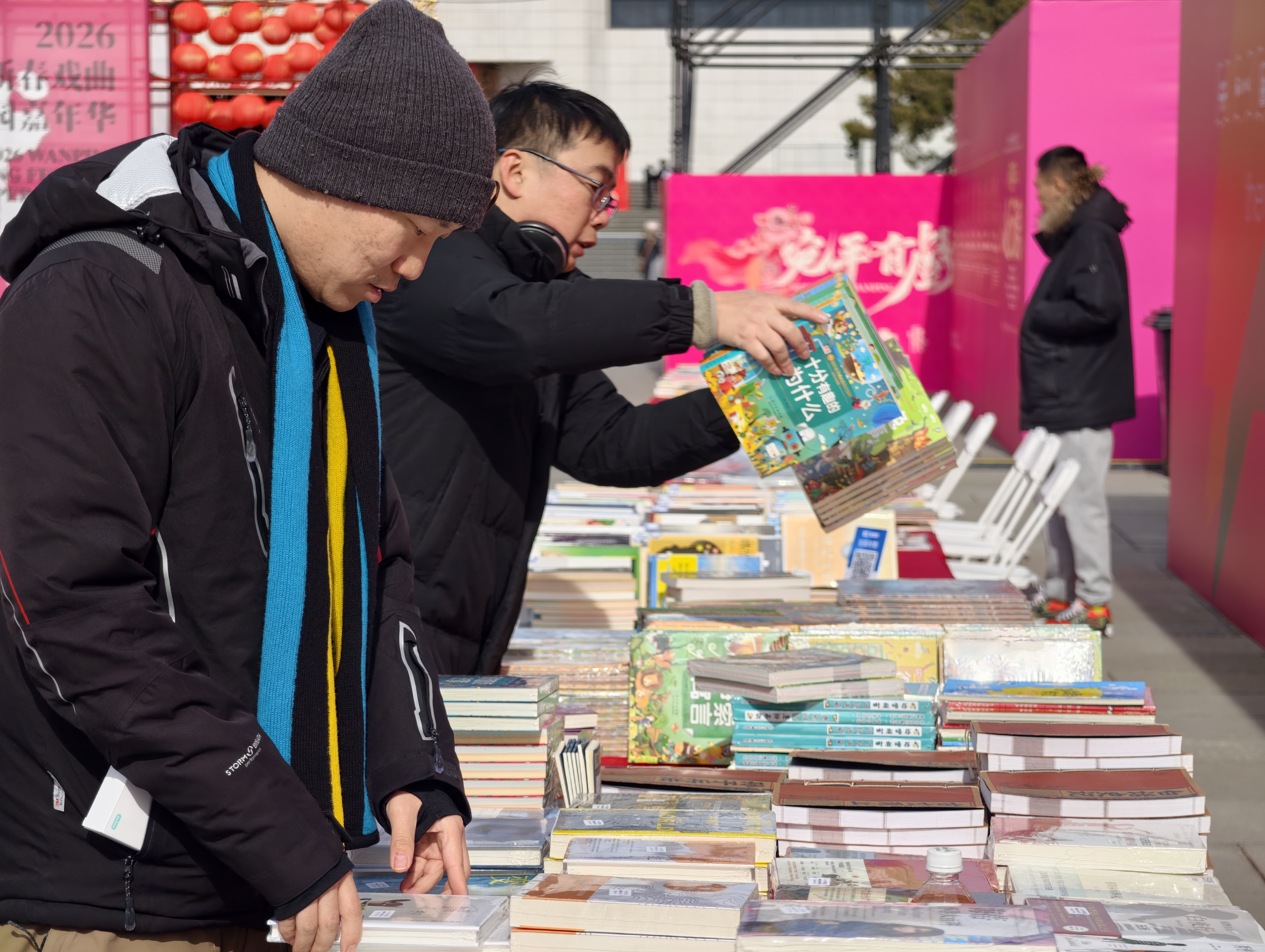 记者在宛平城醒狮广场看到,“宛平旧书部落”书集前人头攒动。红灯笼映衬着青砖灰瓦,远处戏台京韵悠扬,书摊上经典名著、社科读物、少儿绘本一应俱全。家住海淀区的王女士带着孩子,用家中闲置的儿童绘本成功兑换了两张门票,“旧书有了新用处,孩子还能登城墙看风景,又淘到了喜欢的故事书,一举两得。”