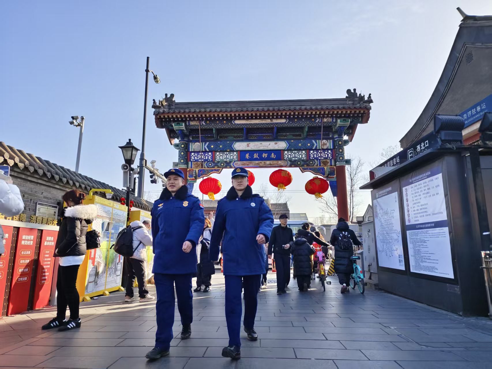 南锣鼓巷商铺林立、人流集中,春节期间,北新桥消防救援站、交道口小型消防站抽调4名队员,分为两个巡逻小组,结合古巷特点,每日重点巡查街巷出入口、人流密集区域等关键点位,以及餐饮店、文创商铺等经营场所,特别关注电气线路集中的部位。执勤中,队员创新推行“宣防一体”机制,设立临时宣传点,提升市民游客消防安全意识,让大家在喜庆氛围中安心过大年、畅游古街巷。