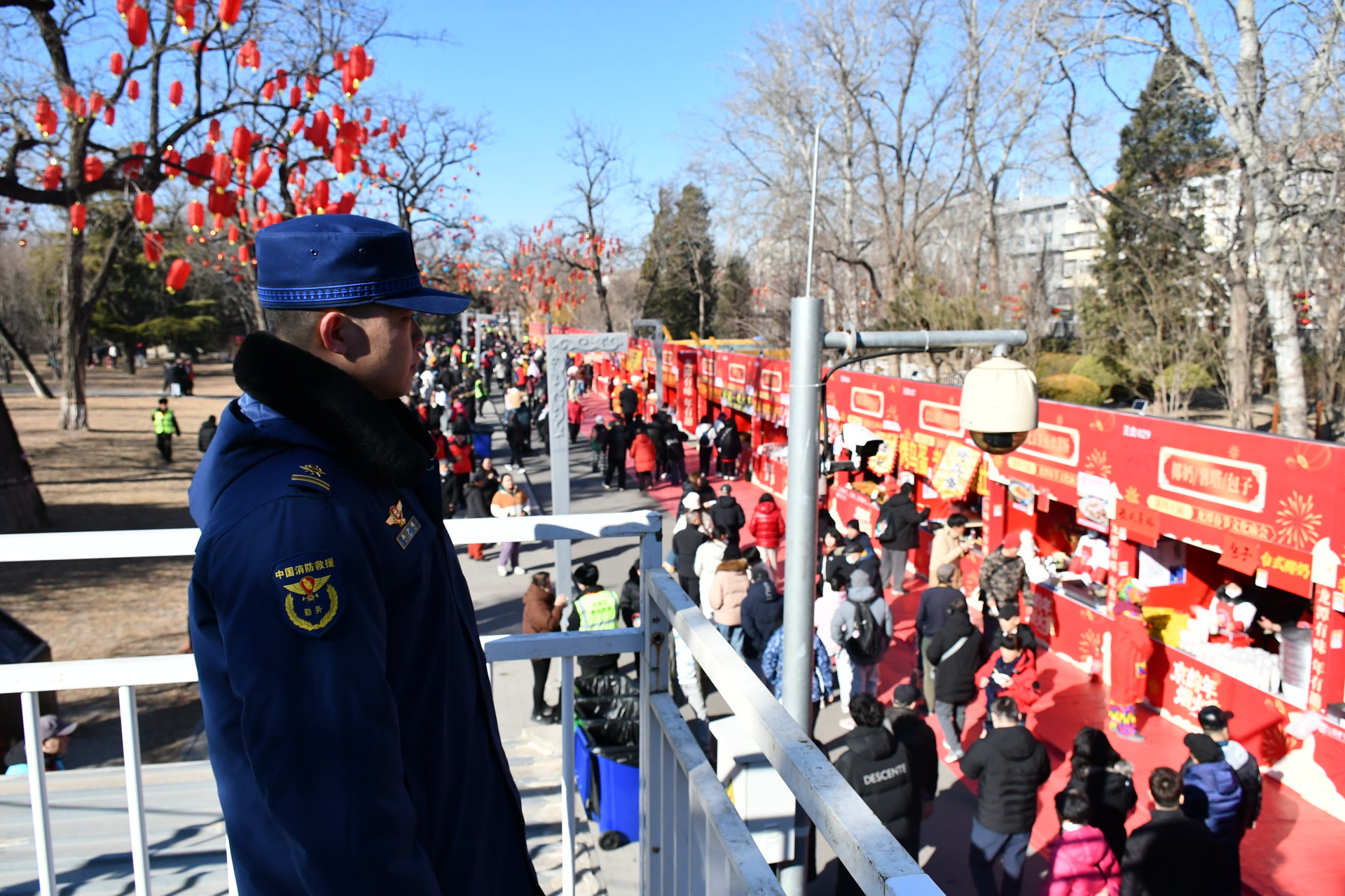 天坛公园和龙潭庙会在龙潭湖消防救援站辖区,春节期间,消防站抽调15名精干队员,既有动态巡逻,也有定点守护,保障新春游园及庙会活动安全有序开展。