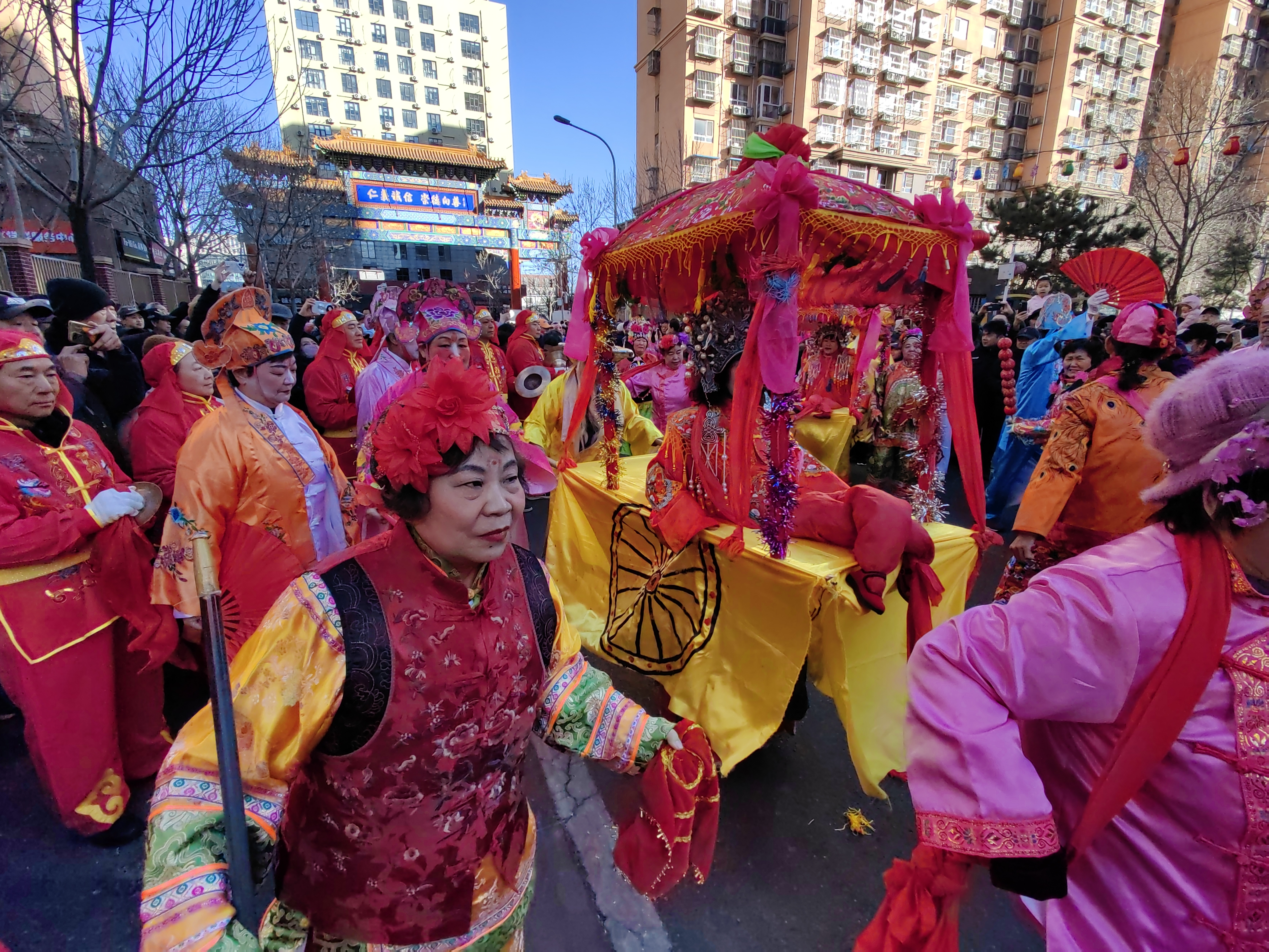 2月18日,农历大年初二,石景山古城街道古城村牌楼,“秉心圣会” 花会玩角儿依次出场,重现民俗踩街表演,一档档花会轮番上演精彩纷呈,获得市民阵阵叫好声。