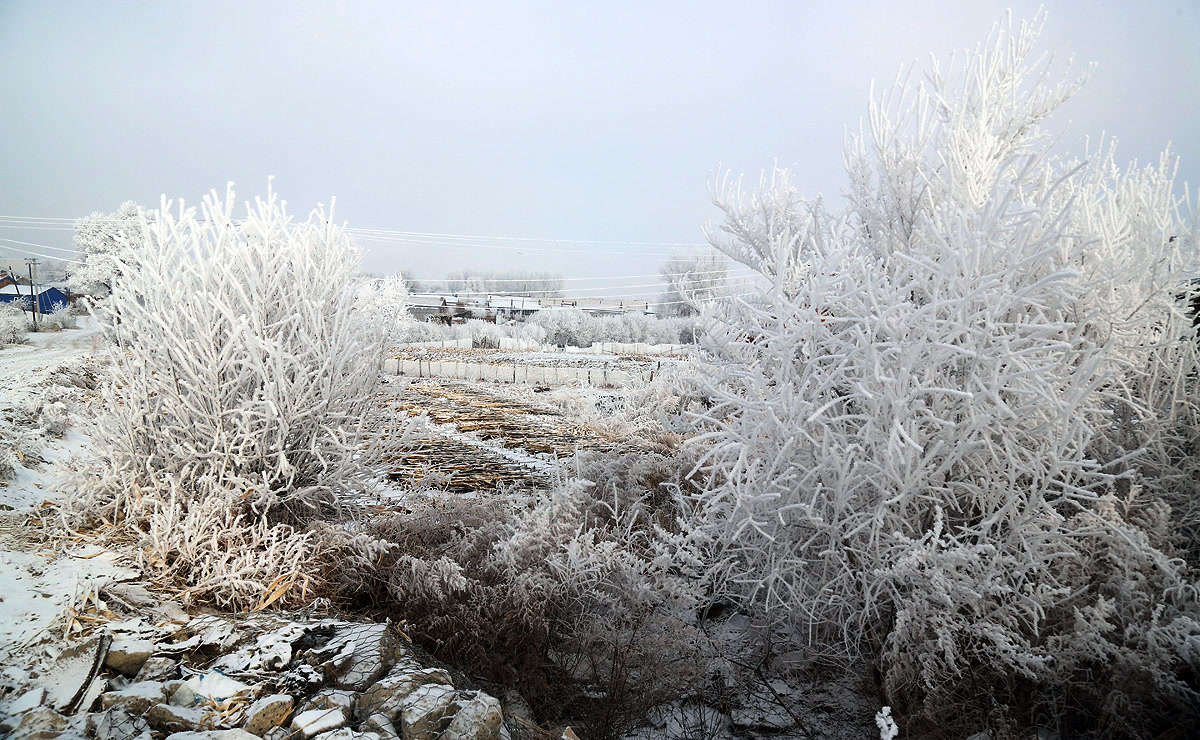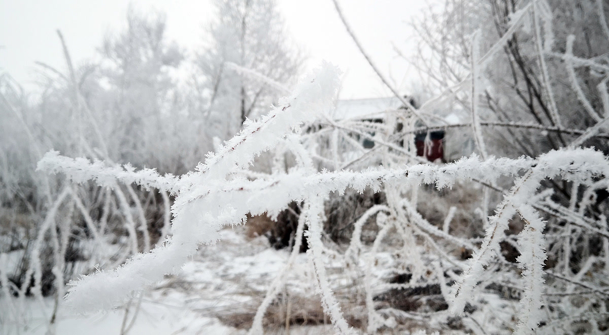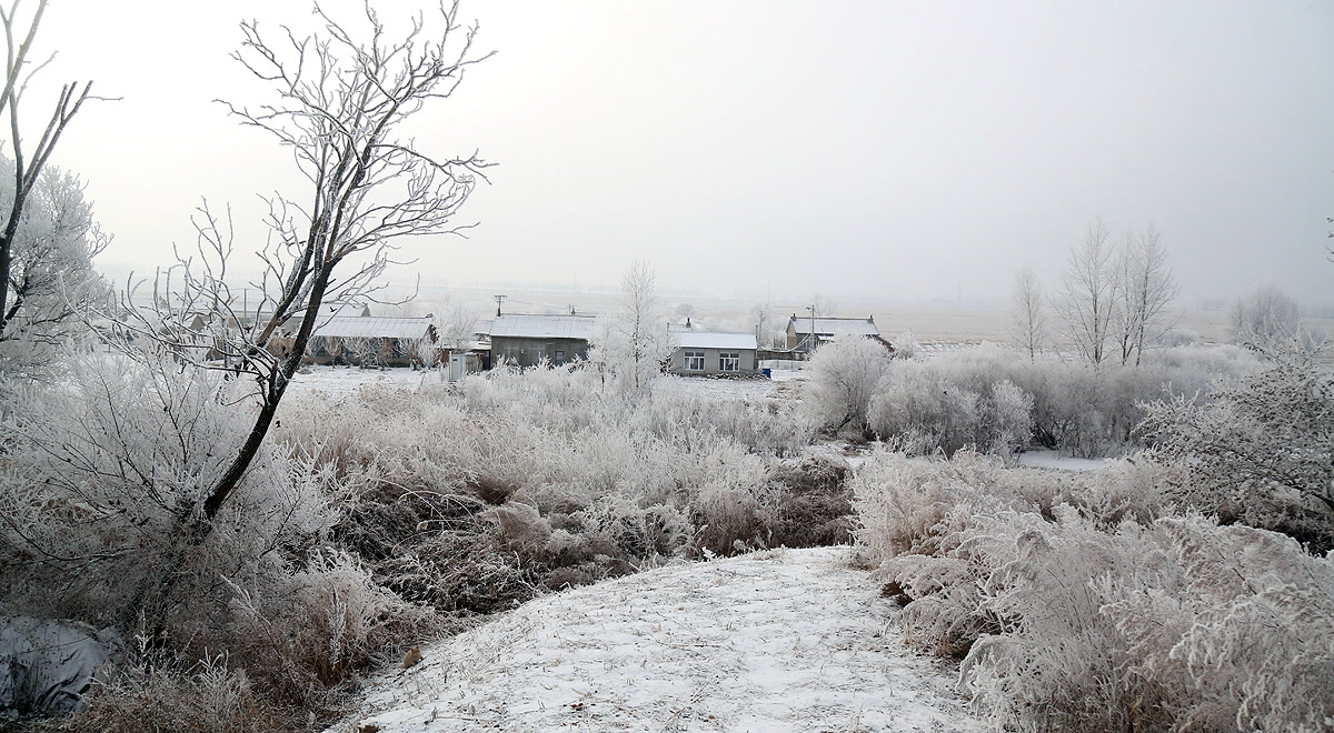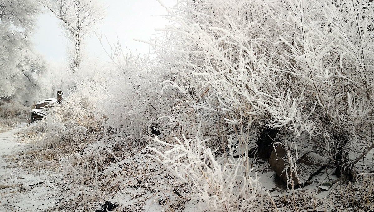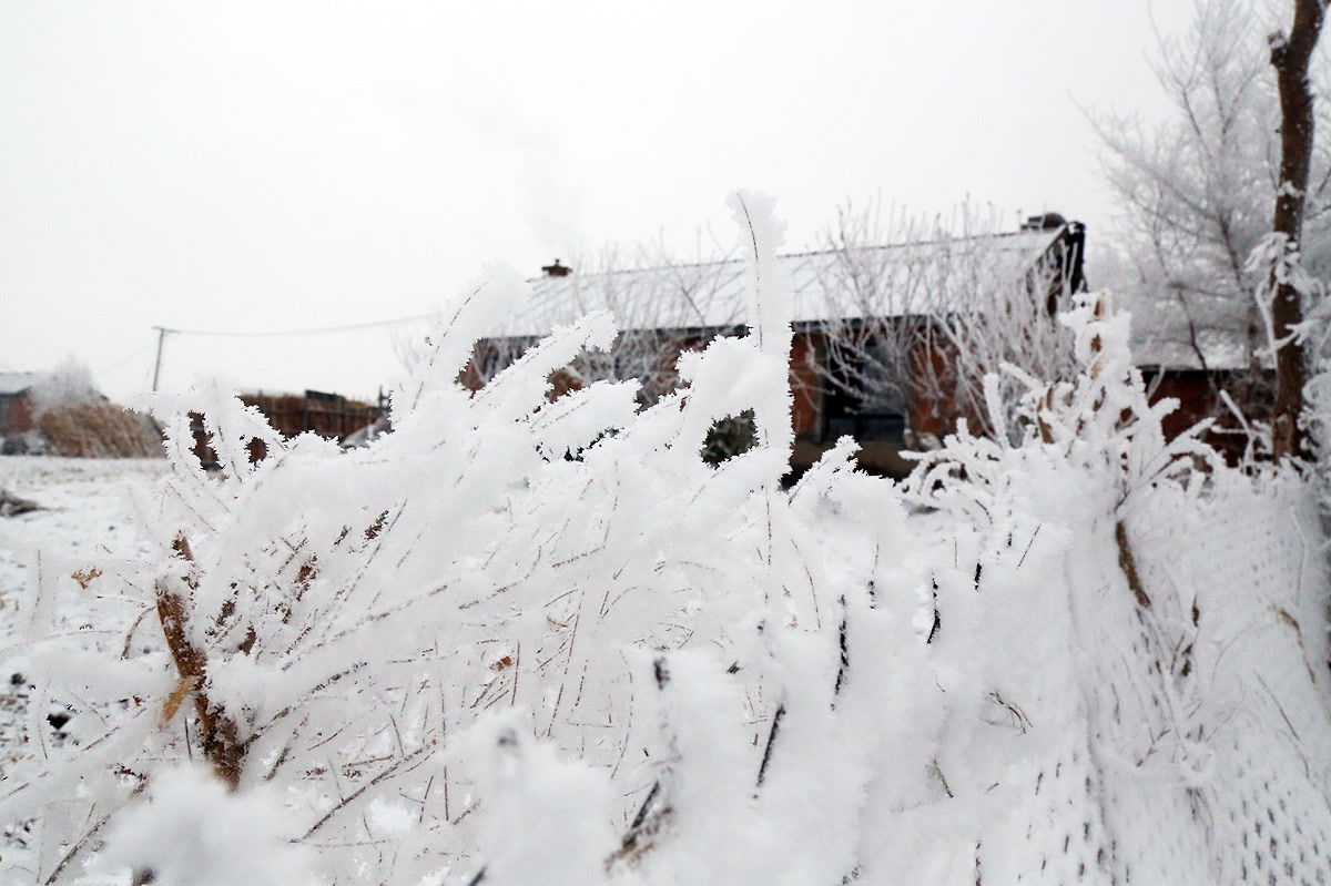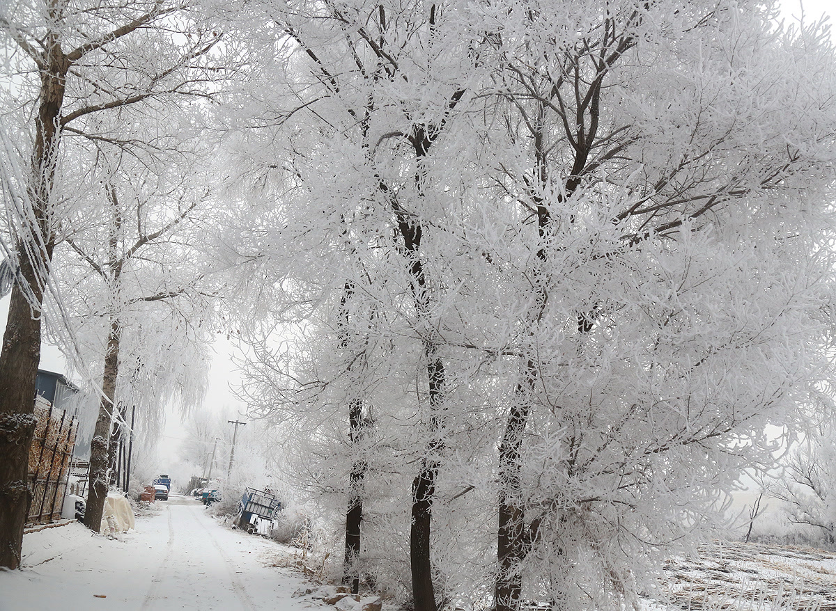 清晨时分,笔者在吉林省长春市九台区苇子沟街道庆阳村看到,整个村落仿佛被一层薄纱笼罩。随着晨雾散去,视线豁然开朗:村路两旁挺立的白杨树、老榆树,甚至农家小院里悬挂的红灯笼,都挂满了毛茸茸、亮晶晶的冰晶。树枝不堪重负微微低垂,风起时,细碎的冰晶随风飘落,在朝阳的映照下闪烁着钻石般的光芒,宛如置身童话世界。