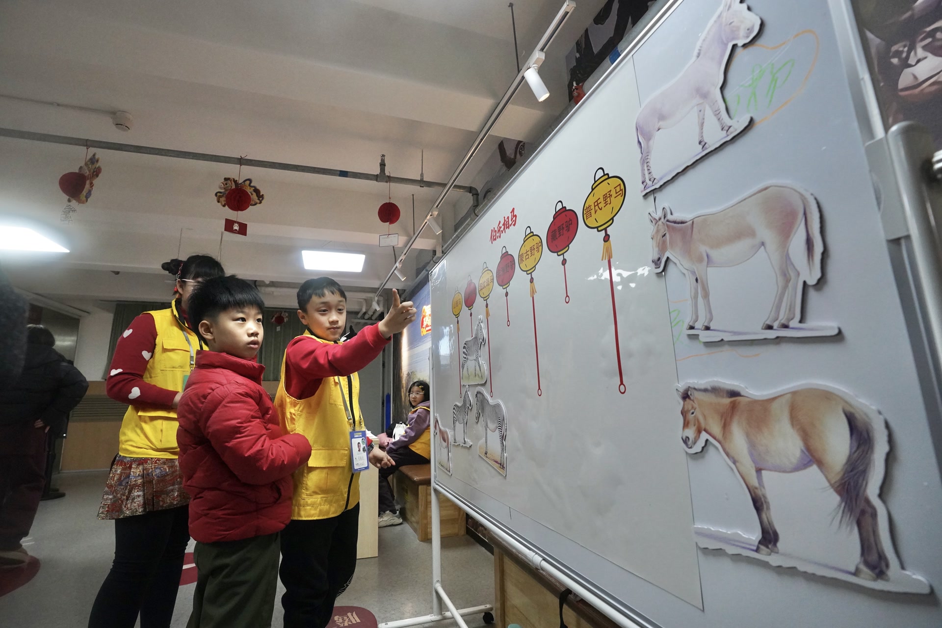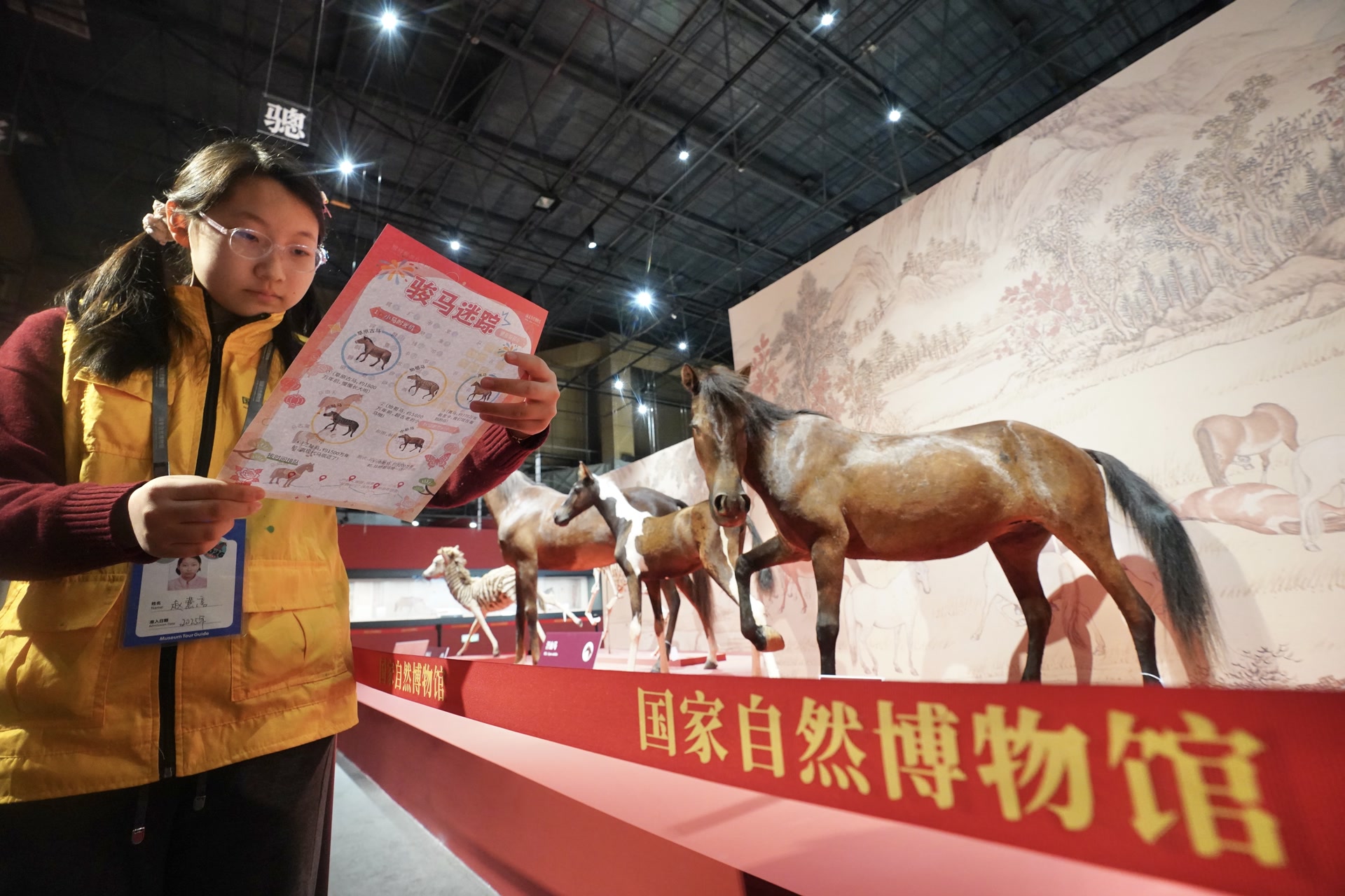 志愿者赵薏淳也是一名小学生,负责在“马舞新春——全球生肖文化联展”展厅组织观众参与“骏马迷踪”活动。她主动介绍自己的工作:“观众参观完展览后,邀请他们回答马的发展历史、性格特征等问题。我还要当讲解员,带观众参观展厅里的马标本。其中,普氏野马是世界上仅存的真正野生马,保存着马属动物古老的基因谱系,堪称马类‘活化石’。”