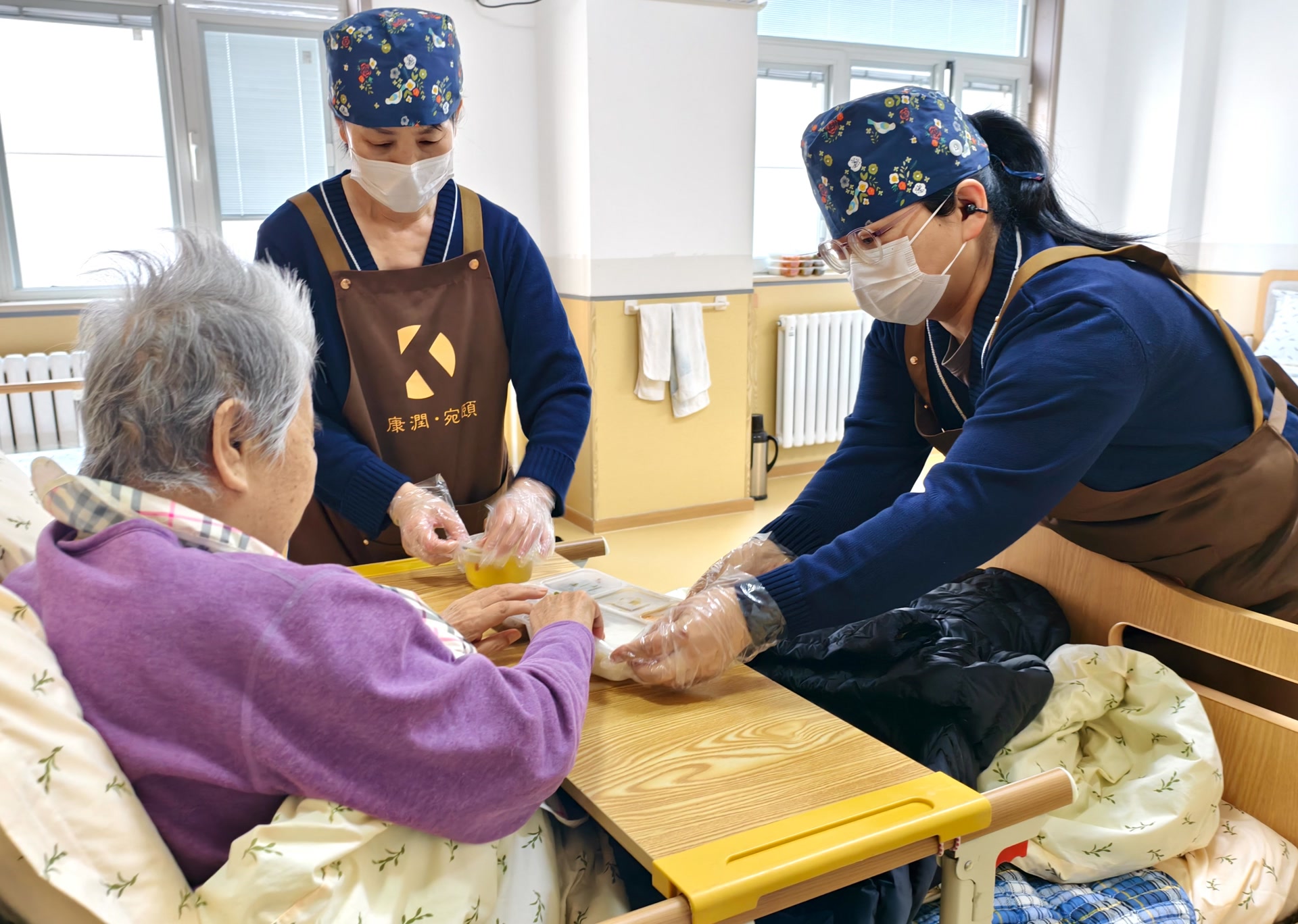 7点是早饭的时间,马玉伶为老人们领了餐,逐一分送。两位老人已经是半失能了,总是半睡半醒地躺在床上。她轻轻地唤醒老人,然后一边招呼着老人注意,一边慢慢地摇起床来。随后,扶老人坐好、摆上小桌板、送上早餐、递上勺子……