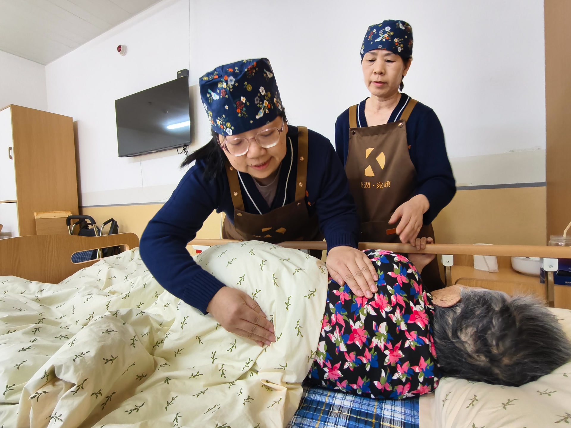 “你干净利落了,老人看着心里也舒坦。”马玉伶说着,戴上小蓝花工作帽,走出了宿舍。虽然这里的老人是6点才起床,但她服务的4位老人中有一位是新入住的,总是醒得很早,她也就会提前进入工作状态,帮老人洗漱,陪老人说说话,让老人一天的开始多些温暖。