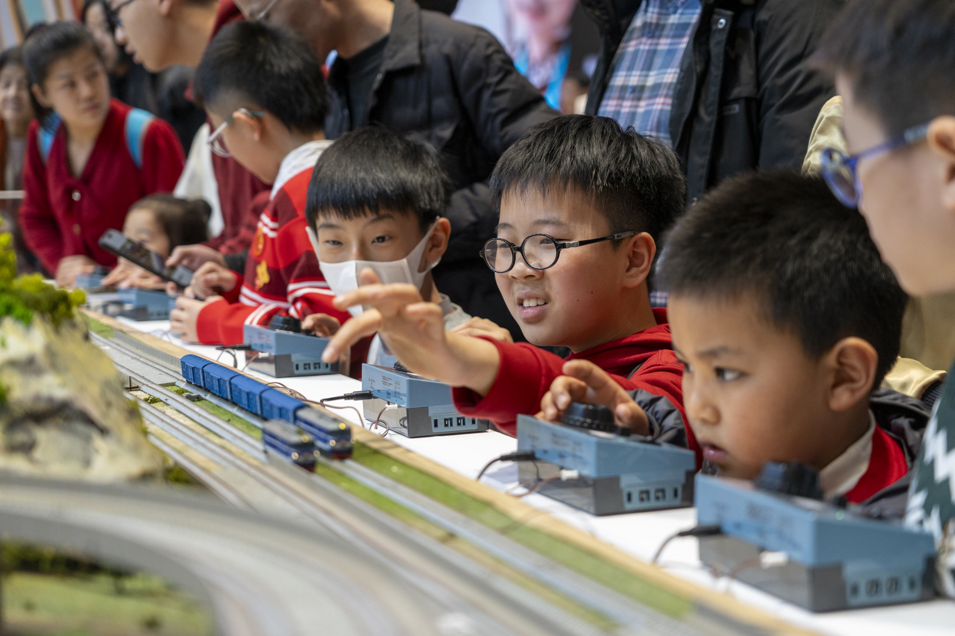 “妈妈快看!这里还能开火车!”还未走近展位,记者就听到孩子们兴奋的呼喊声。在展位的核心区域,一个按1:1比例仿真的高铁模拟驾驶舱成为绝对的“人气王”。在工作人员的引导下,刚“抢”到驾驶位的小男孩航航深吸一口气,双手缓缓推动操作手柄。随着他的动作,前方大屏幕上的模拟场景飞速后退,列车平稳启动、加速。“我真的在开高铁了!”航航化身“高铁司机”,眼睛紧紧盯着前方的虚拟轨道,那专注的神情,仿佛真的在守护一车旅客的平安。旁边的家长也举起手机,记录下这难忘的一刻。
