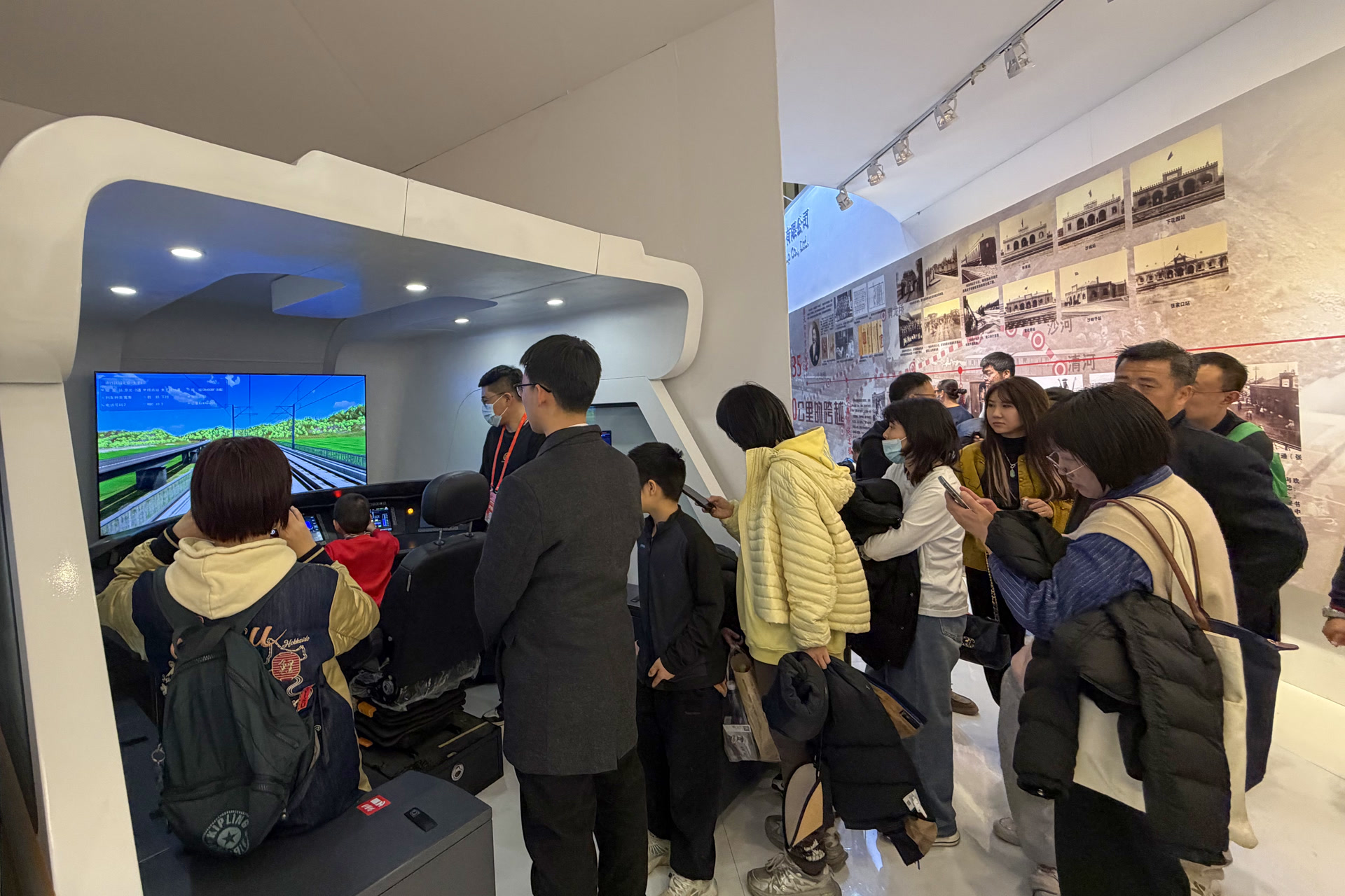 紧邻模拟驾驶舱的,是一面精心布置的历史文化展板。展板上,从詹天佑主持修建的京张铁路老照片,到时速350公里的智能京张高铁风采,百年京张的沧桑巨变在此浓缩呈现。