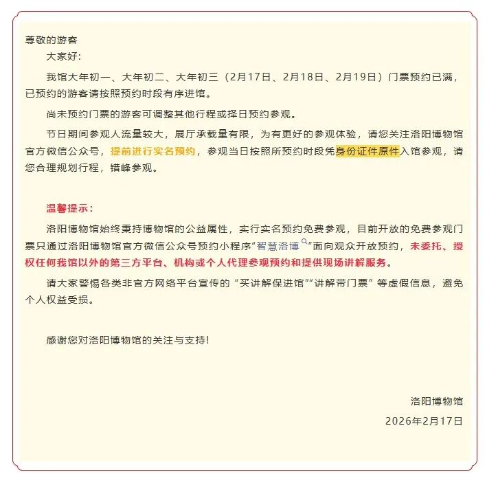 洛阳博物馆2月18日、2月19日门票预约已满,已预约的游客请按照预约时段有序进馆。尚未预约门票的游客可调整其他行程或择日预约参观。