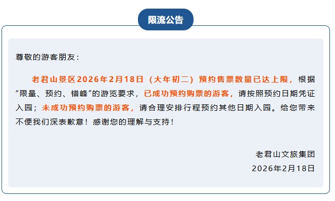 老君山景区2026年2月18日(大年初二)预约售票数量已达上限。已成功预约购票的游客,请按照预约日期凭证入园;未成功预约购票的游客,请合理安排行程预约其他日期入园。