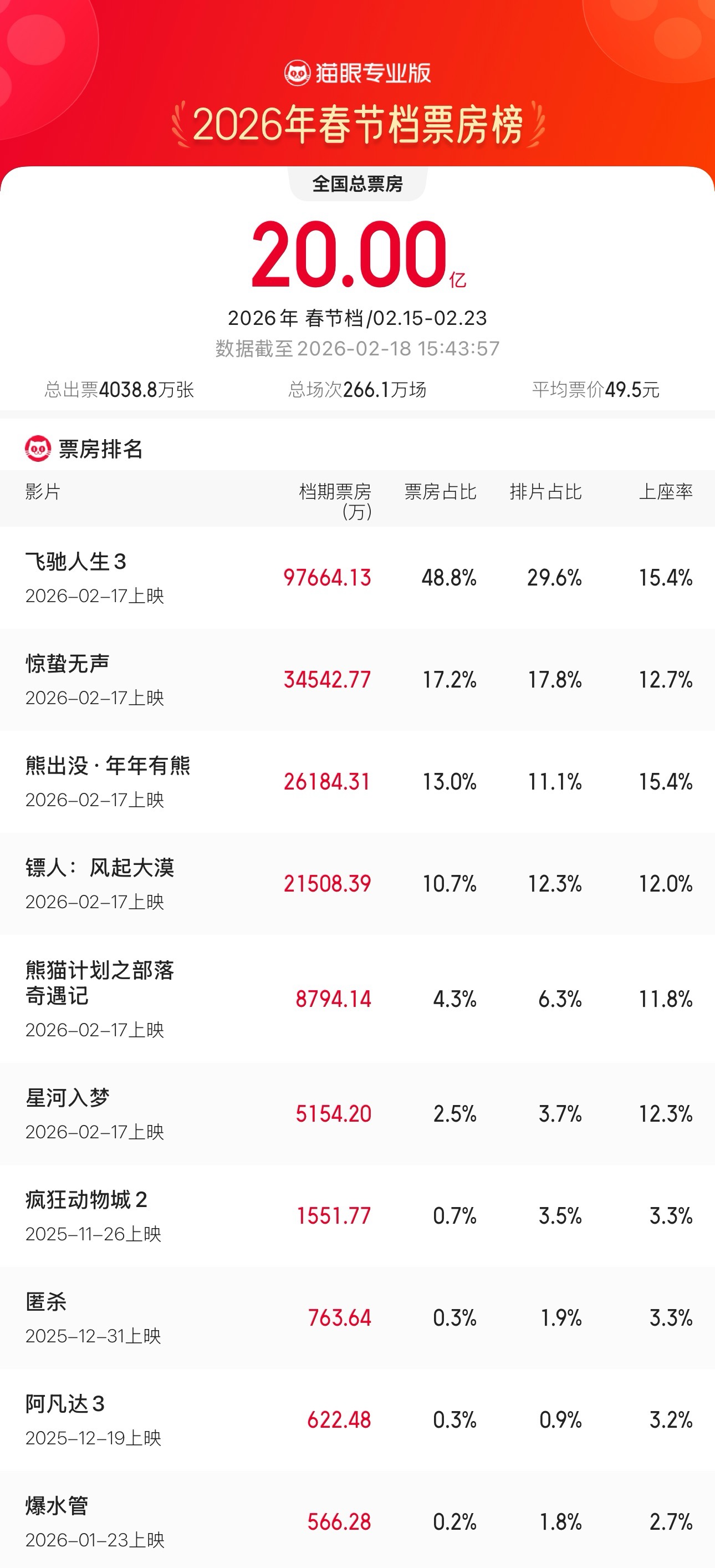 据猫眼专业版数据,截至2月18日15时43分,2026年春节档档期总票房(含预售)破20亿,《飞驰人生3》《惊蛰无声》《熊出没·年年有熊》分列前三位。