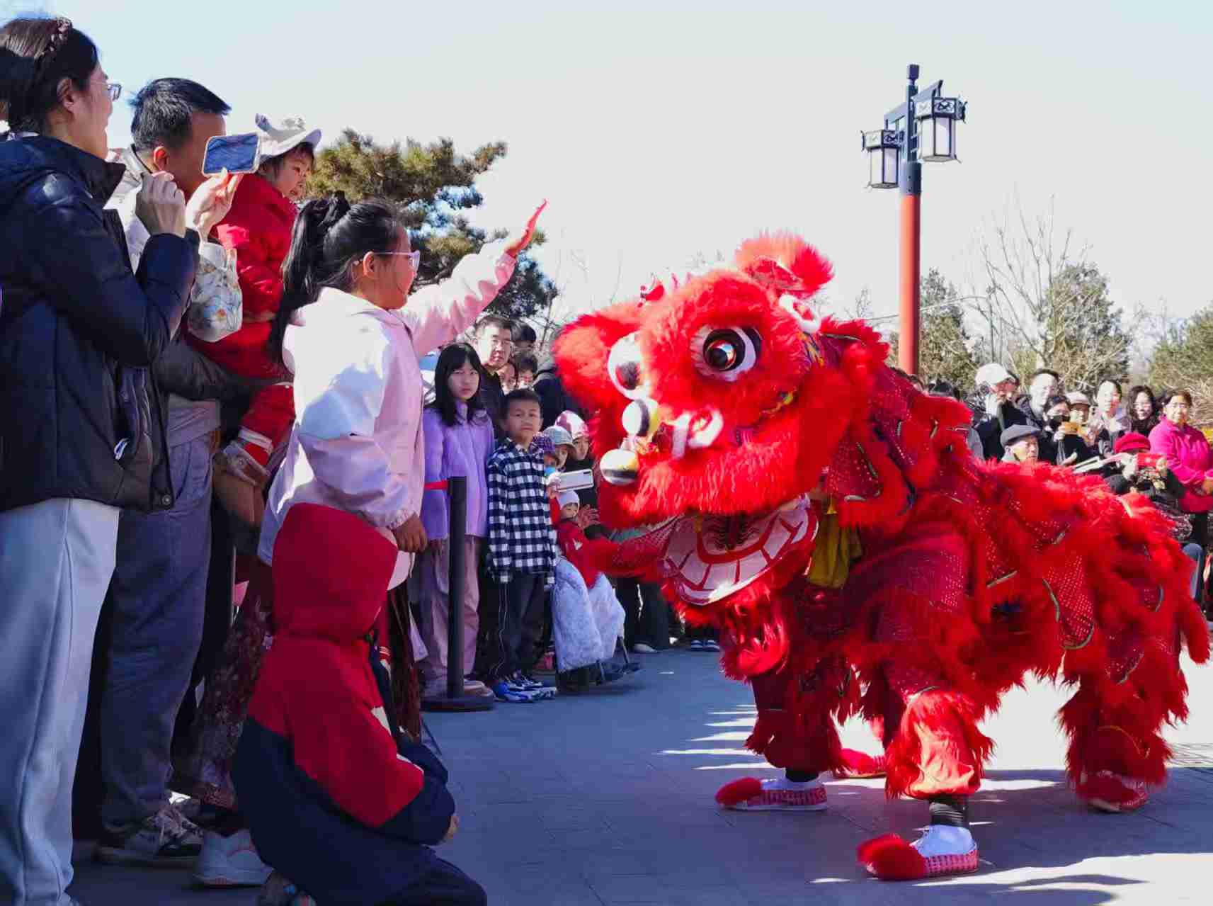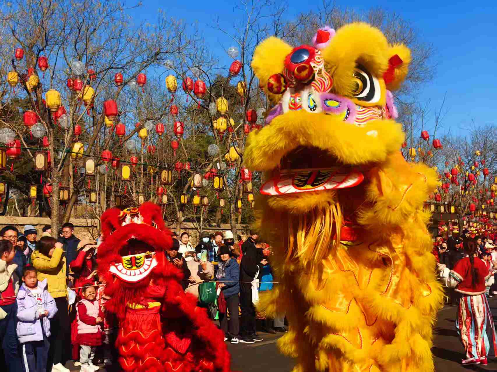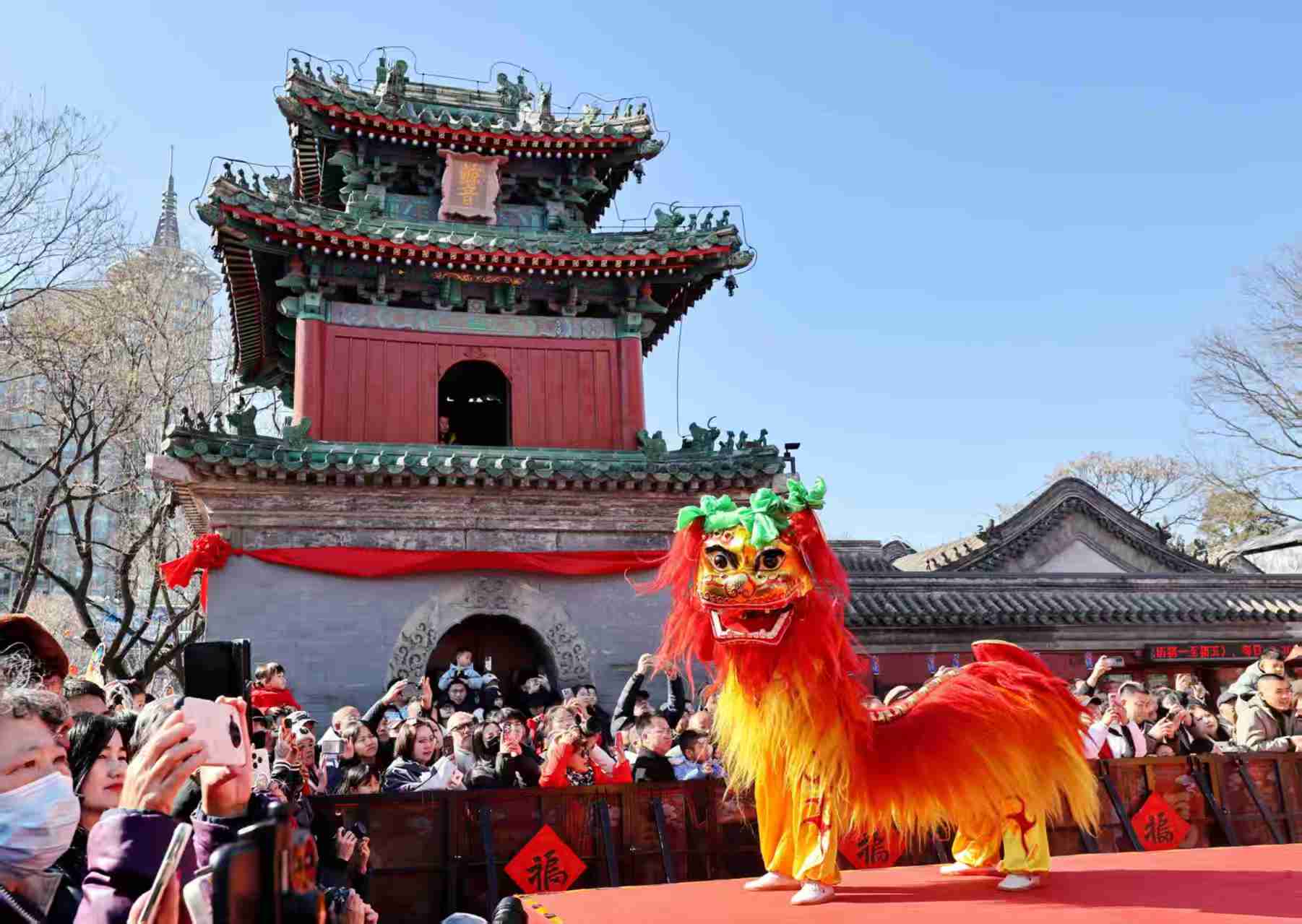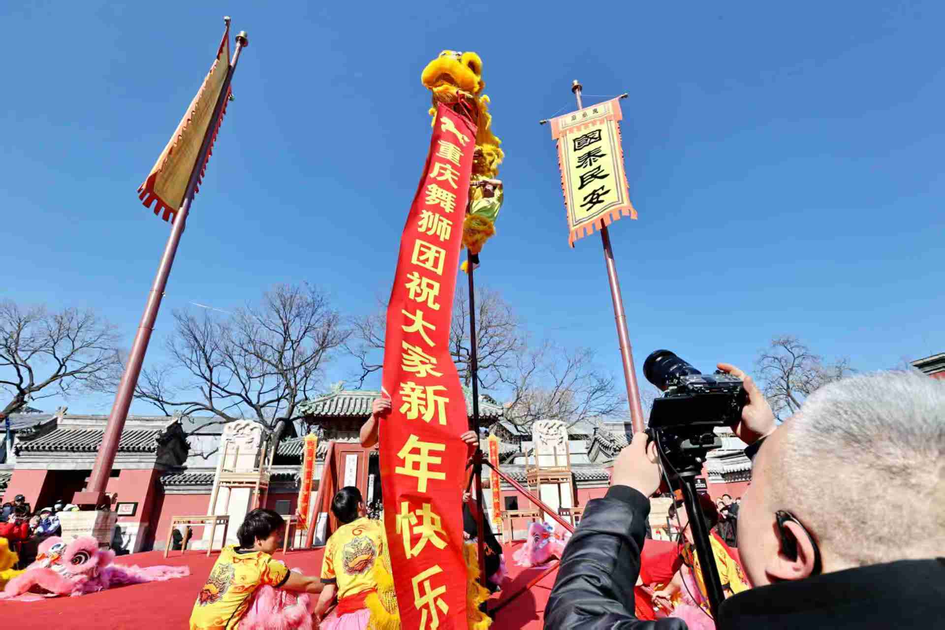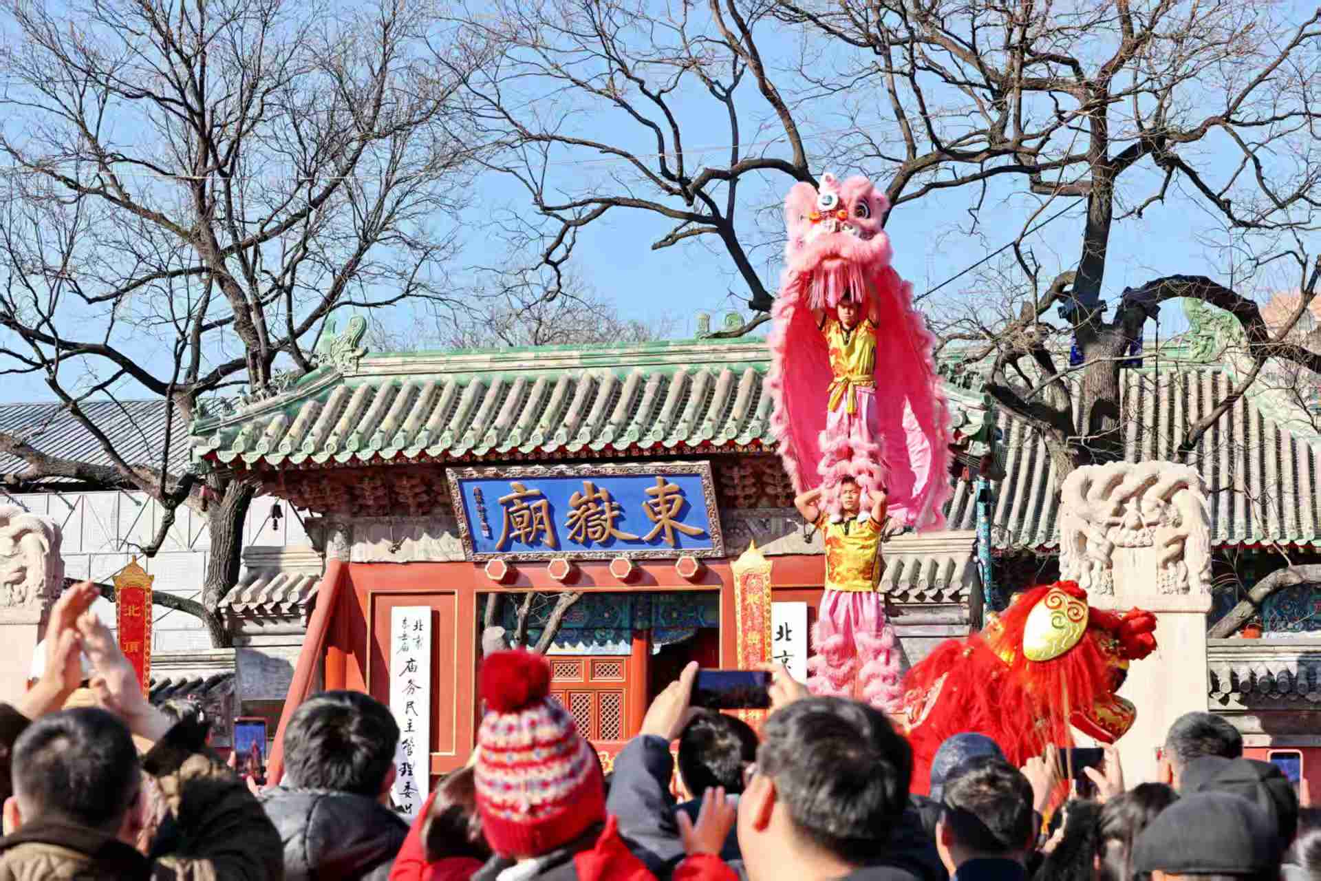 在北京民俗博物馆举行的东岳庙庙会上,来自重庆的舞狮团为市民游客进行舞狮表演,共贺新春。