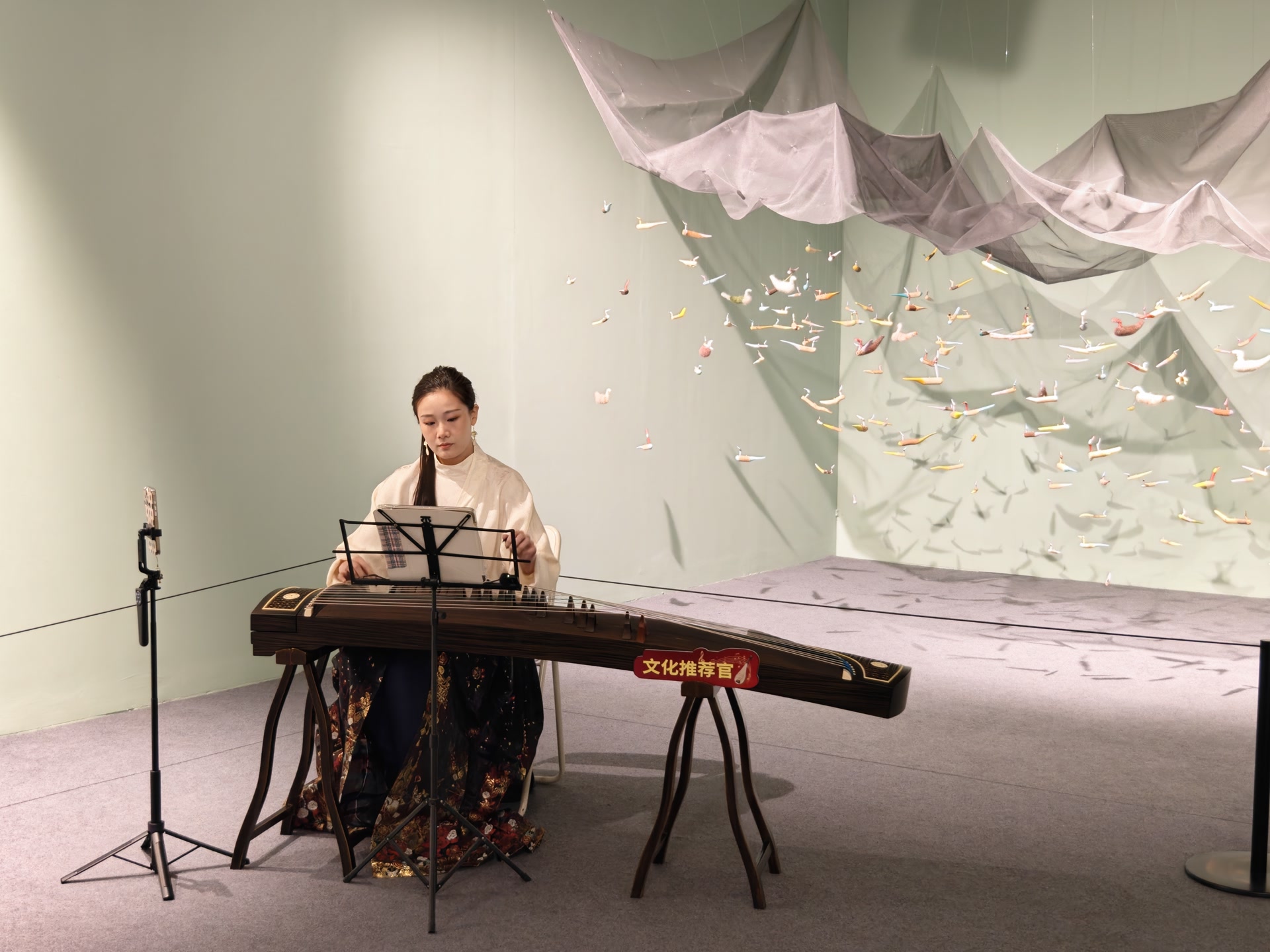 这一方琴音袅袅的角落,成为展厅里的打卡地。一批批观众走过,或驻足拍照,或静静聆听。琴韵与画意相映成趣,为双年展“共生”的主题写下一段流动的注脚。
