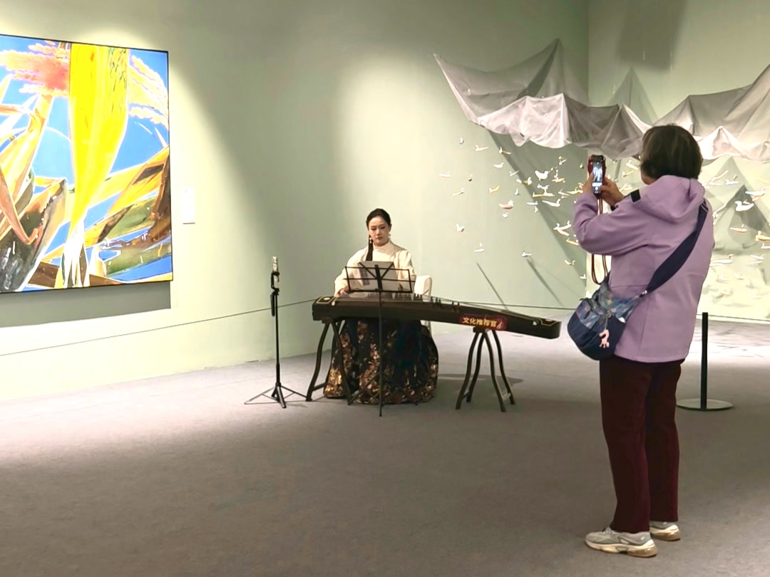 “国际美术双年展我早就想来了,但一到过年就忙忙活活,过了初一反而清闲,今天正好出来走走。”刘慧芬是个观展爱好者,这天一早就出了门,在展厅里意外邂逅古筝演奏,她很是惊喜,得知演奏者来自专业院团,由衷称赞道,“真棒!”