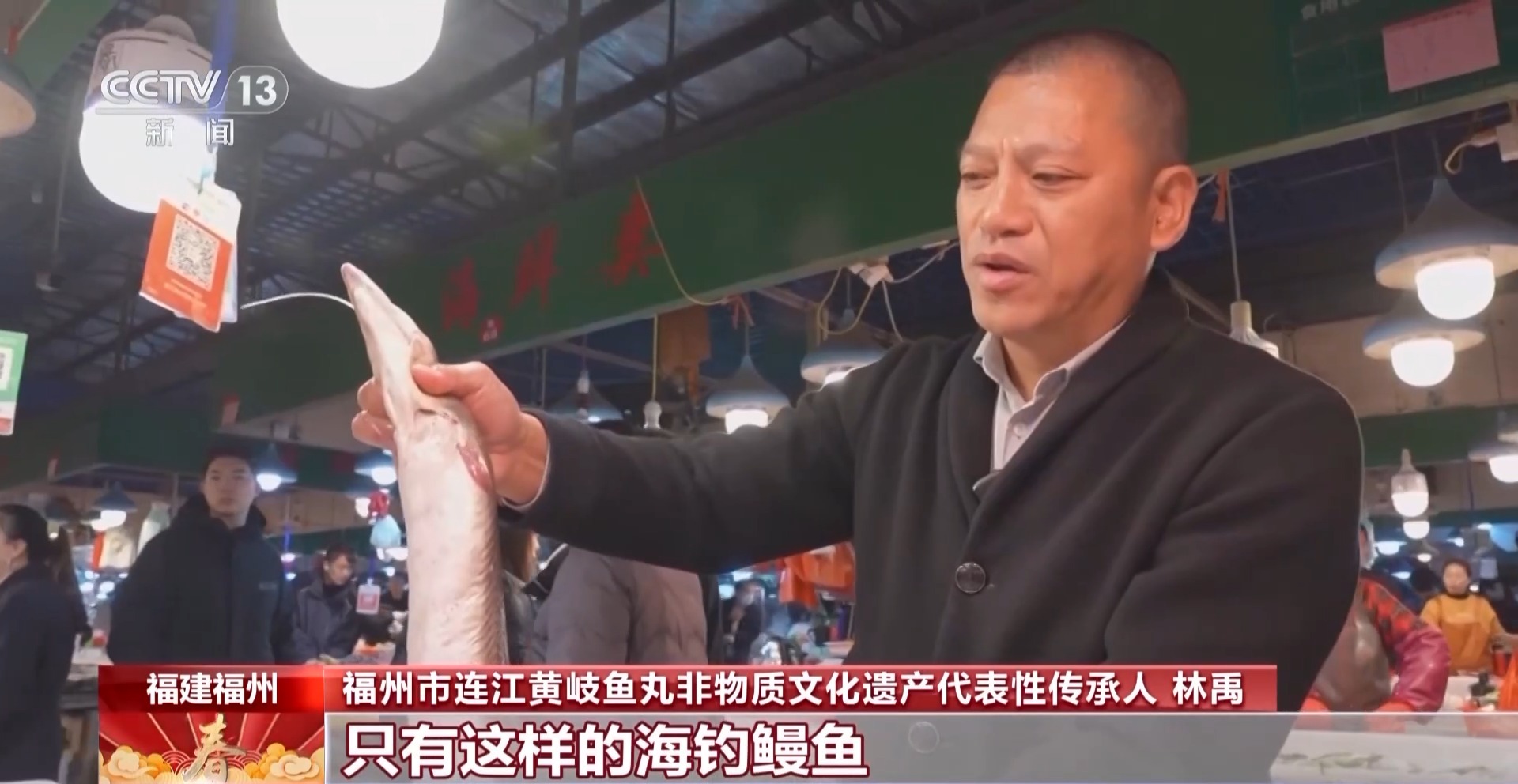 福州市连江黄岐鱼丸非物质文化遗产代表性传承人 林禹:做鱼丸,首选鱼肉要鲜。今天刚从码头拉上来的海钓鳗鱼,鲜香味才会足,才会浓。我们本地的猪肉,吃起来肉非常紧实。