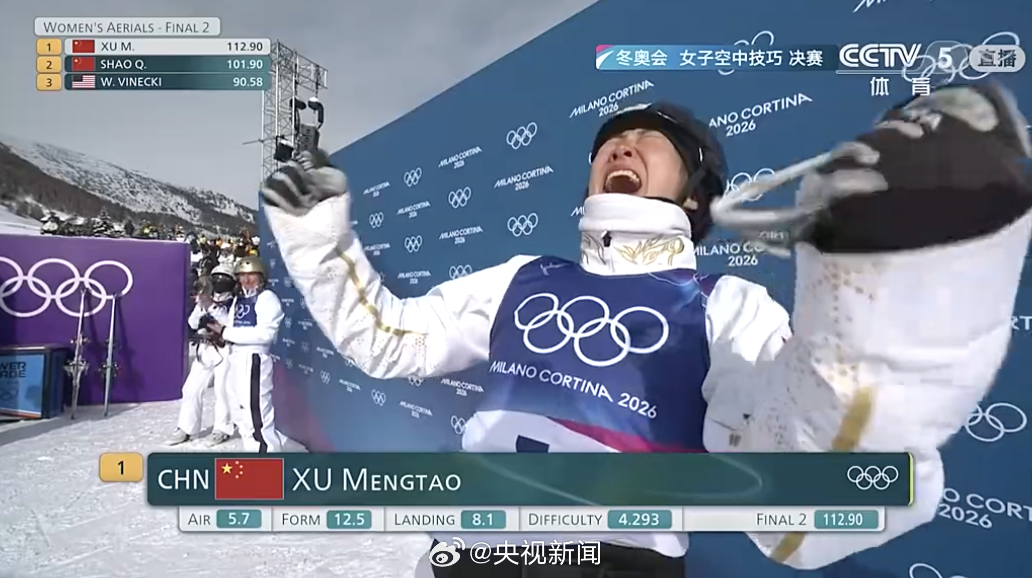 北京时间2月18日晚,在2026年米兰冬奥会自由式滑雪女子空中技巧决赛中,北京冬奥会该项目冠军、中国名将徐梦桃成功卫冕,为中国代表团再添一枚金牌。另外两位进入决赛最终轮的中国选手,邵琪收获铜牌,孔凡钰收获第四名