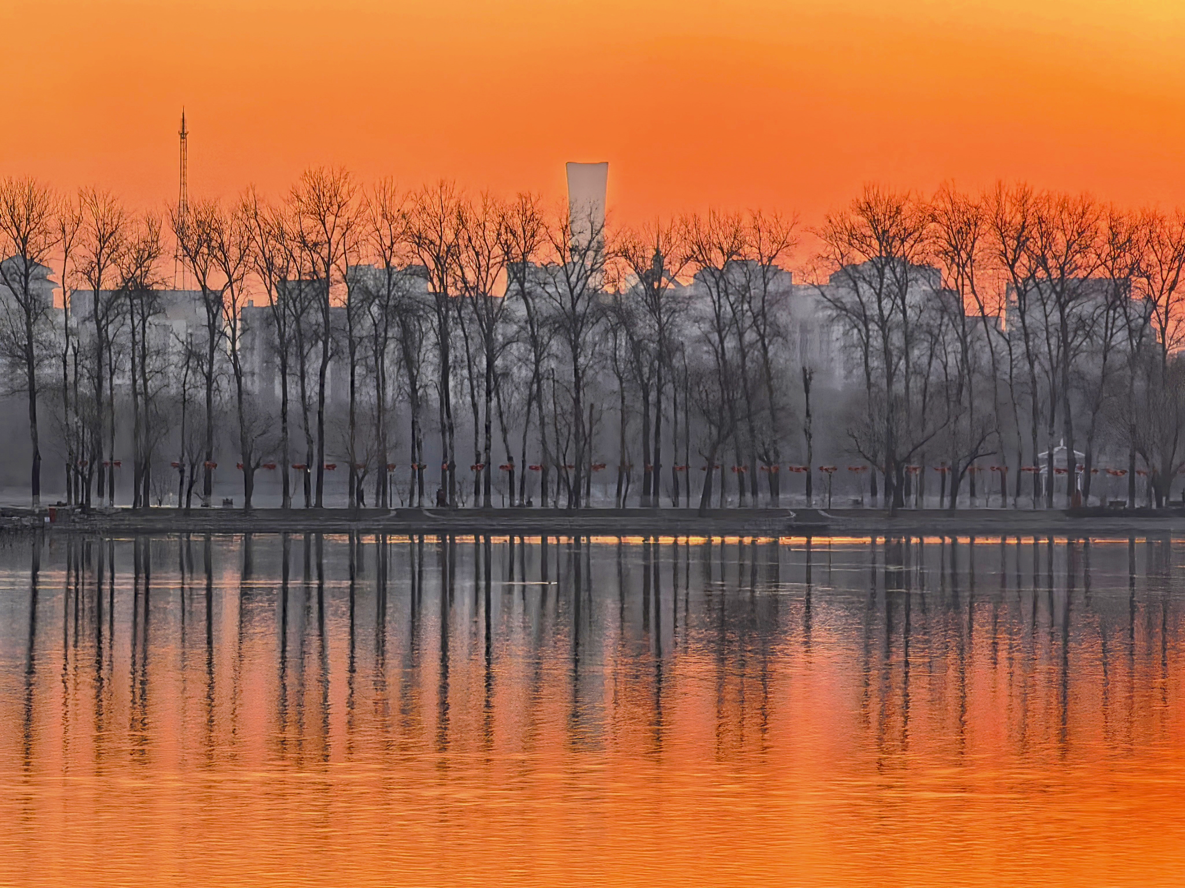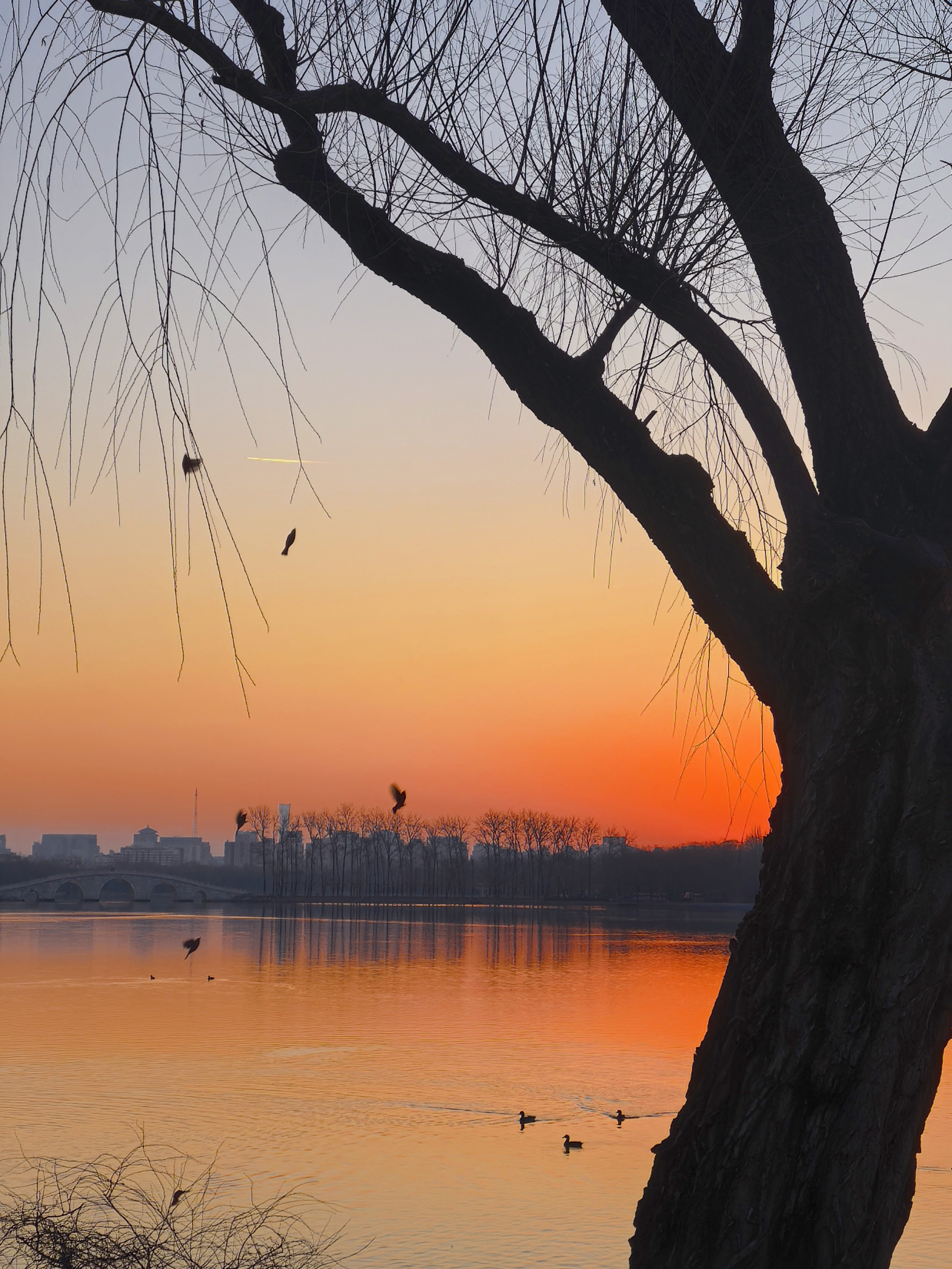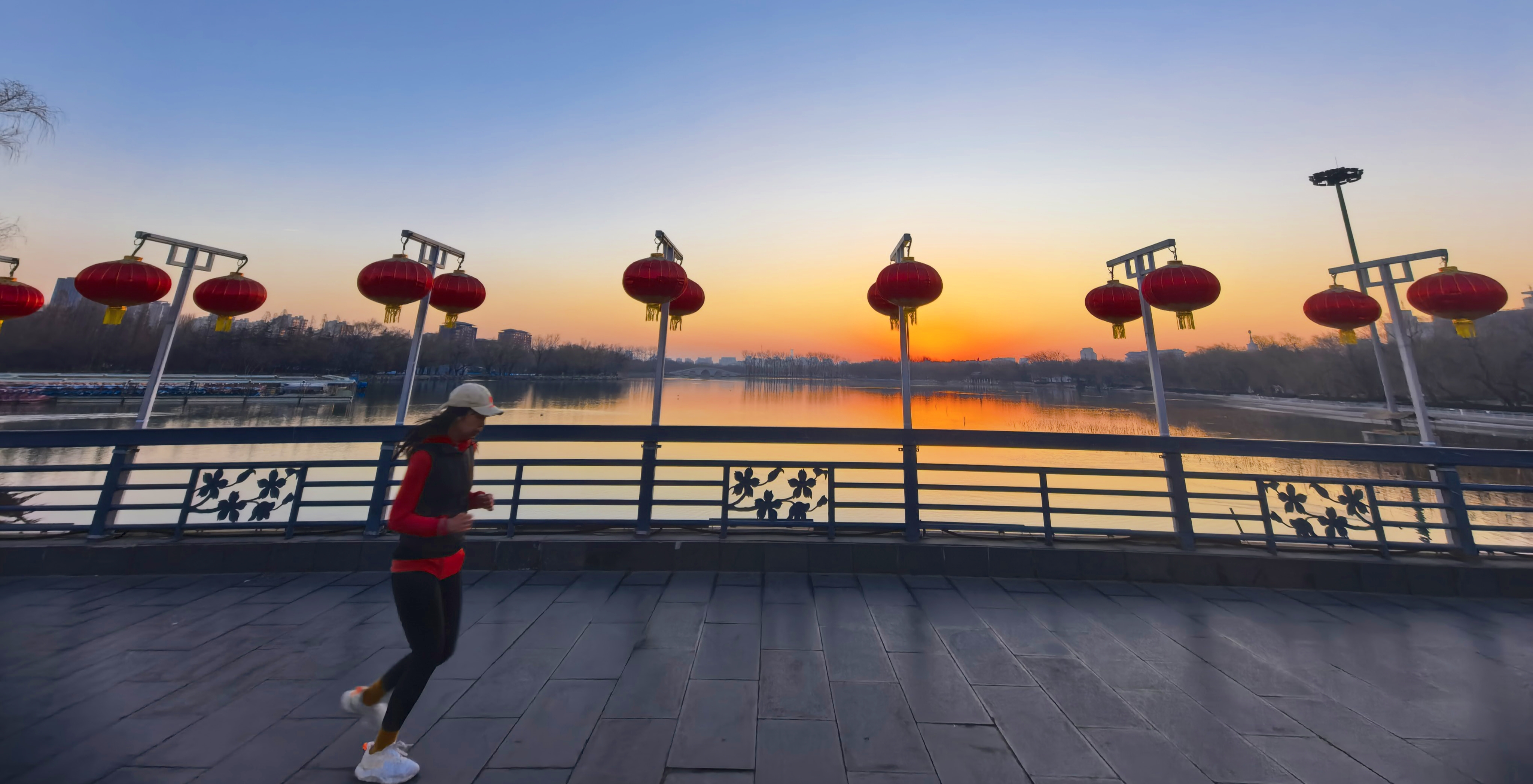 大年初三,一城朝霞暖,鹊鸣迎福来,欢跑映霞光。