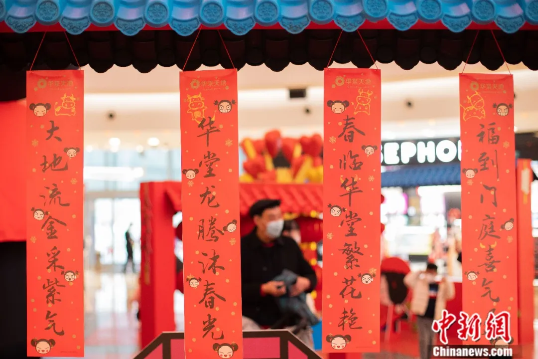 资料图:江苏南京一商场内张贴的春联吸引市民的目光。泱波 摄