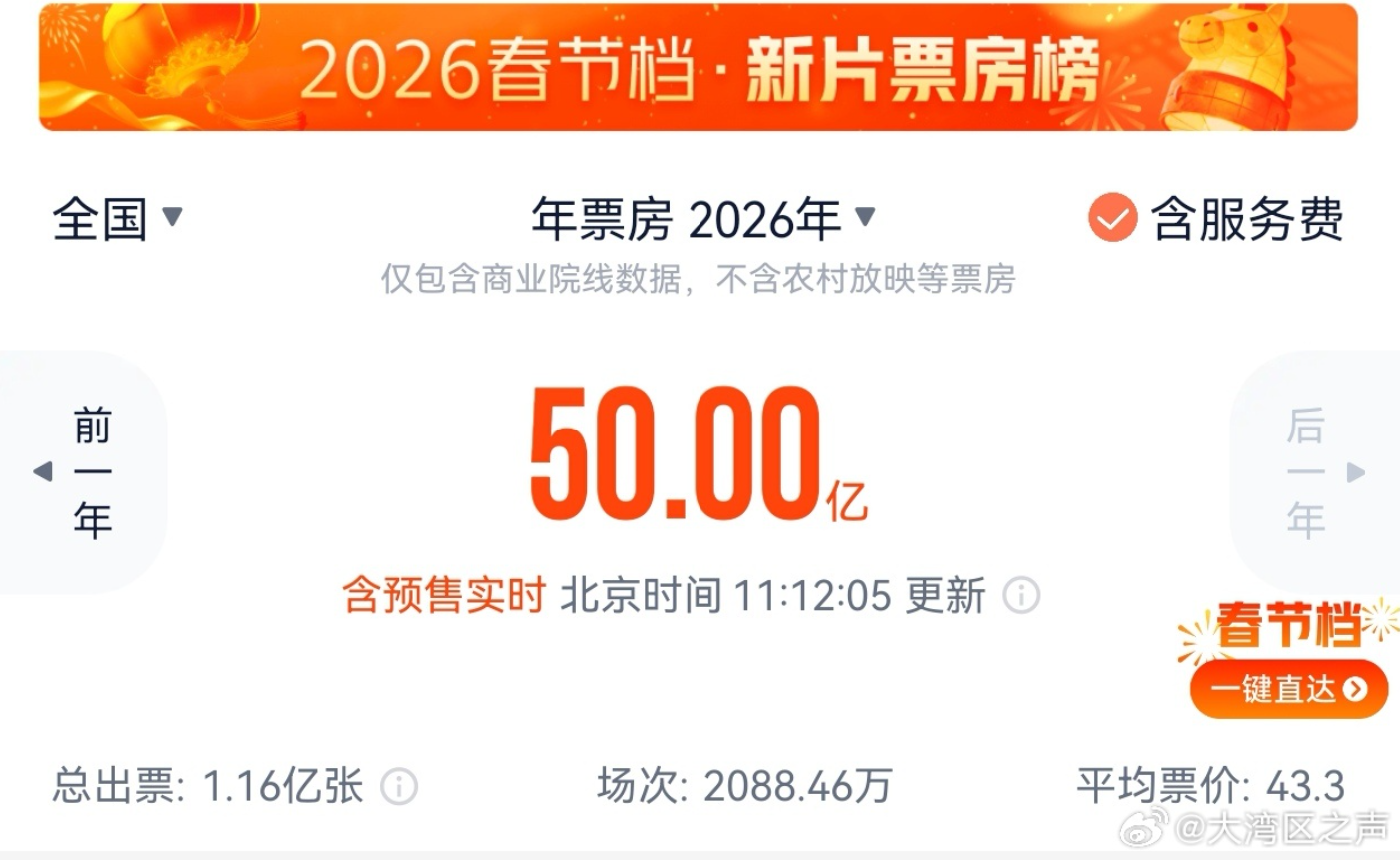 据网络平台数据,截至2月19日11时12分,2026年电影票房(含预售实时)突破50亿元。