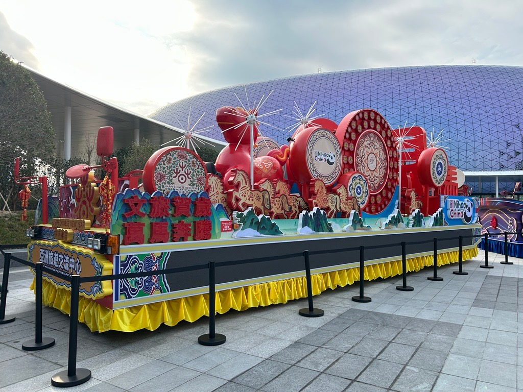 2月18日至26日,市民游客可在园区内三大指定区域近距离观赏花车。八辆花车主题鲜明、工艺细致,融合传统年俗与现代设计元素。入夜后花车灯光亮起,流光溢彩,不少家庭结伴前来观赏拍照,园区内洋溢着喜庆热闹的节日气息。