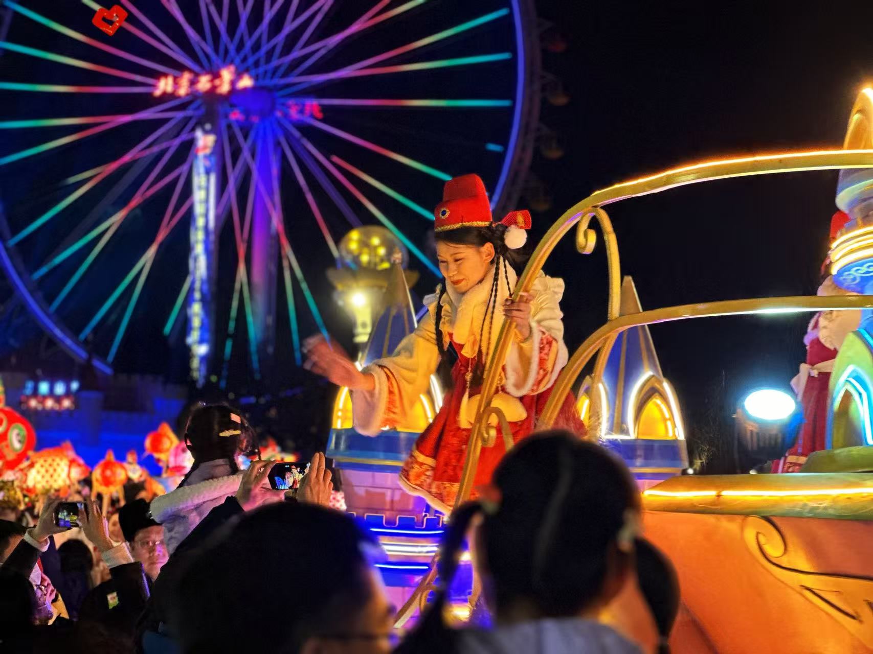 巡游荟,精彩交融:除了震撼的非遗表演,园区内主题花车与优雅灵动的鱼灯巡游轮番亮相,营造出如梦似幻的游园氛围。摩天轮下的舞台同样精彩不断,各类文艺表演轮番登场,为不同年龄层的游客带来了别样的欢乐。