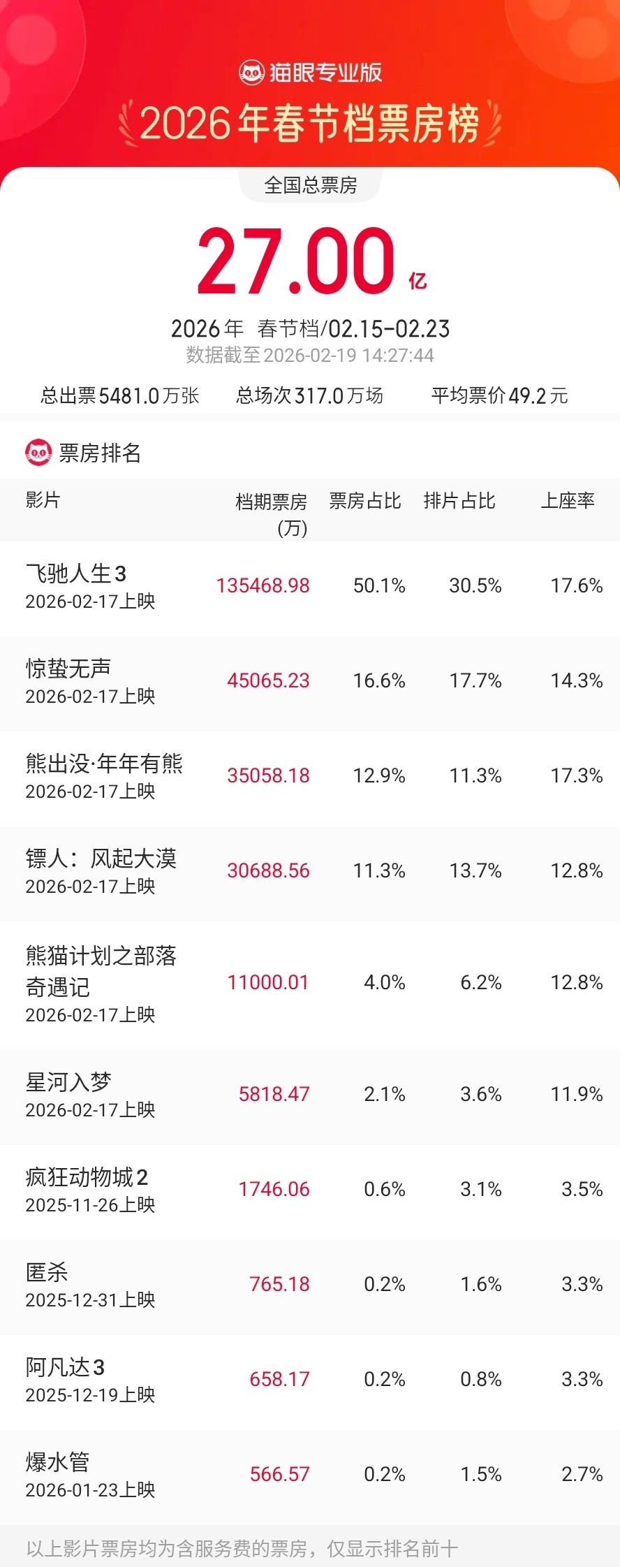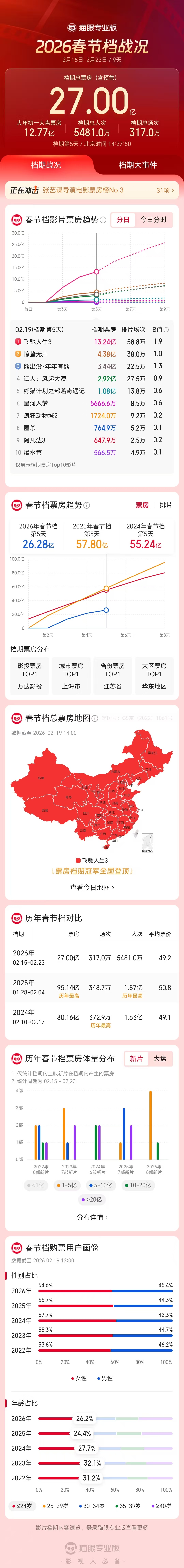 据猫眼专业版数据,2026年春节档档期总票房(含预售)破27亿,《飞驰人生3》《惊蛰无声》《熊出没·年年有熊》分列前三位。